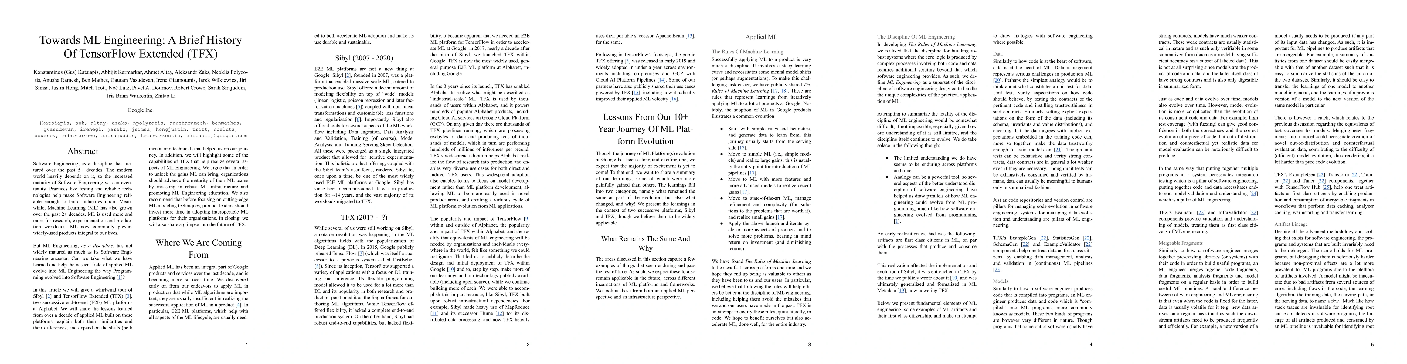 This paper provides a historical overview of TensorFlow Extended (TFX) and its predecessor Sibyl, two end-to-end ML platforms developed by Alphabet. It emphasizes the importance of advancing ML Engineering to achieve the same maturity as Software Engineering, advocating for robust ML infrastructure and education.