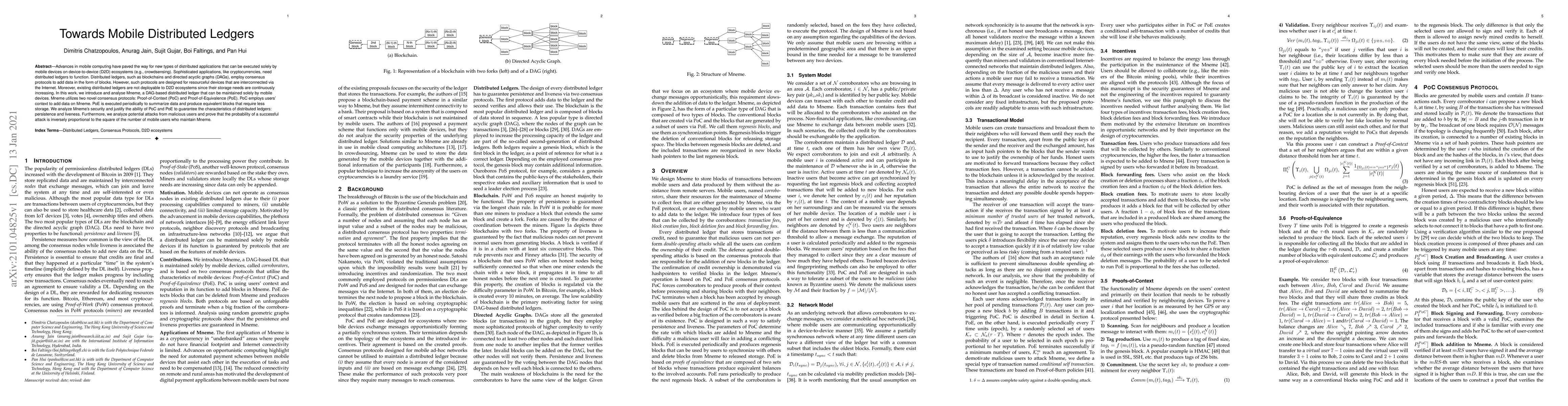 Advances in mobile computing have paved the way for new types of distributed applications that can be executed solely by mobile devices on device-to-device (D2D) ecosystems (e.g., crowdsensing). Sophisticated applications, like cryptocurrencies, need distributed ledgers to function. Distributed ledgers, such as blockchains and directed acyclic graphs (DAGs), employ consensus protocols to add data in the form of blocks. However, such protocols are designed for resourceful devices that are interconnected via the Internet. Moreover, existing distributed ledgers are not deployable to D2D ecosystems since their storage needs are continuously increasing. In this work, we introduce and analyse Mneme, a DAG-based distributed ledger that can be maintained solely by mobile devices. Mneme utilizes two novel consensus protocols: Proof-of-Context (PoC) and Proof-of-Equivalence (PoE). PoC employs users' context to add data on Mneme. PoE is executed periodically to summarize data and produce equivalent blocks that require less storage. We analyze Mneme's security and justify the ability of PoC and PoE to guarantee the characteristics of distributed ledgers: persistence and liveness. Furthermore, we analyze potential attacks from malicious users and prove that the probability of a successful attack is inversely proportional to the square of the number of mobile users who maintain Mneme.