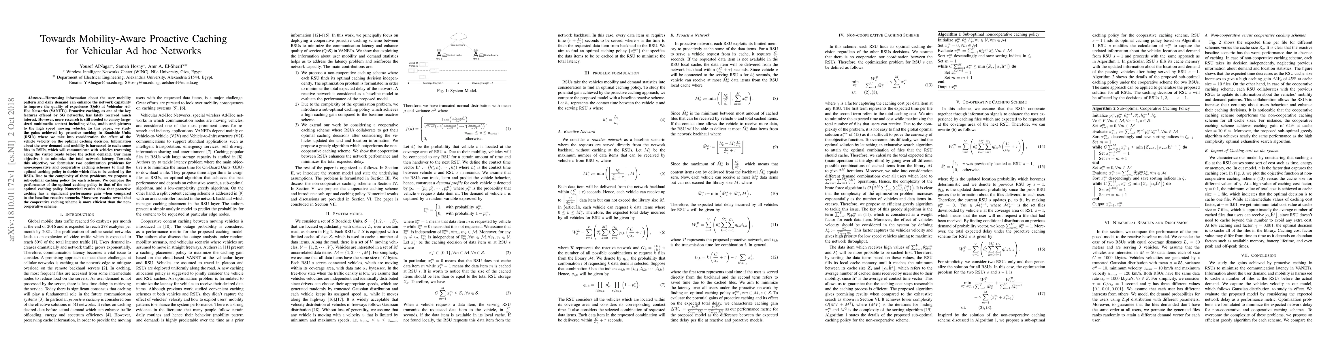 This paper explores proactive caching in Vehicular Ad hoc Networks (VANETs) to enhance network performance by leveraging user mobility and demand patterns. It formulates optimization problems to determine optimal caching policies in non-cooperative and cooperative schemes, proposing sub-optimal solutions due to problem complexity. Results indicate significant latency reduction and superior performance of the cooperative caching scheme compared to the reactive baseline.