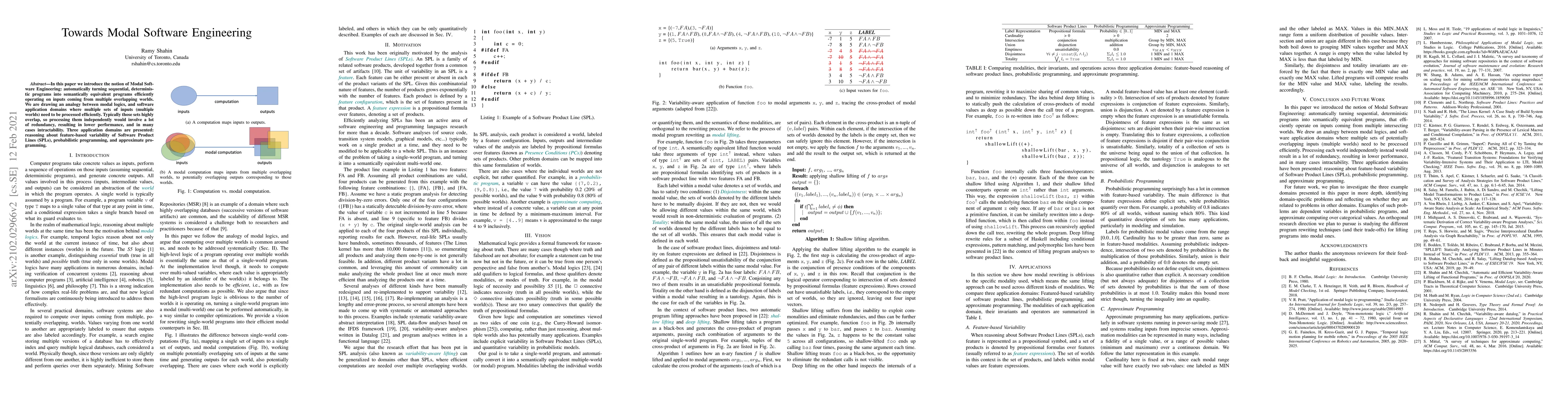 In this paper we introduce the notion of Modal Software Engineering: automatically turning sequential, deterministic programs into semantically equivalent programs efficiently operating on inputs coming from multiple overlapping worlds. We are drawing an analogy between modal logics, and software application domains where multiple sets of inputs (multiple worlds) need to be processed efficiently. Typically those sets highly overlap, so processing them independently would involve a lot of redundancy, resulting in lower performance, and in many cases intractability. Three application domains are presented: reasoning about feature-based variability of Software Product Lines (SPLs), probabilistic programming, and approximate programming.