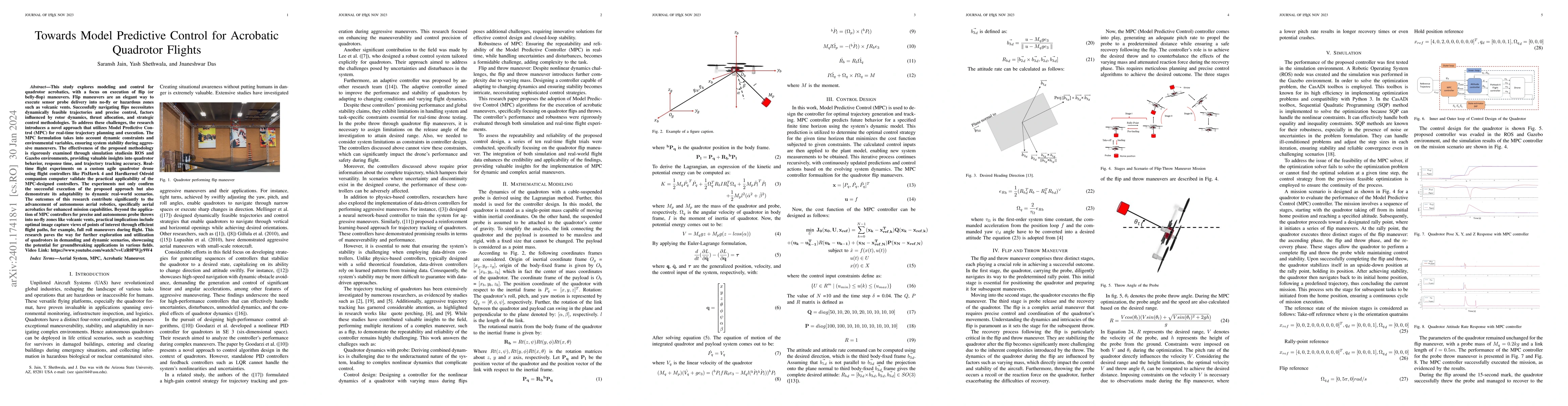 This study explores modeling and control for quadrotor acrobatics, focusing on executing flip maneuvers. Flips are an elegant way to deliver sensor probes into no-fly or hazardous zones, like volcanic vents. Successful flips require feasible trajectories and precise control, influenced by rotor dynamics, thrust allocation, and control methodologies. The research introduces a novel approach using Model Predictive Control (MPC) for real-time trajectory planning. The MPC considers dynamic constraints and environmental variables, ensuring system stability during maneuvers. The proposed methodology's effectiveness is examined through simulation studies in ROS and Gazebo, providing insights into quadrotor behavior, response time, and trajectory accuracy. Real-time flight experiments on a custom agile quadrotor using PixHawk 4 and Hardkernel Odroid validate MPC-designed controllers. Experiments confirm successful execution and adaptability to real-world scenarios. Outcomes contribute to autonomous aerial robotics, especially aerial acrobatics, enhancing mission capabilities. MPC controllers find applications in probe throws and optimal image capture views through efficient flight paths, e.g., full roll maneuvers. This research paves the way for quadrotors in demanding scenarios, showcasing groundbreaking applications. Video Link: \url{ https://www.youtube.com/watch?v=UzR0PWjy9W4}