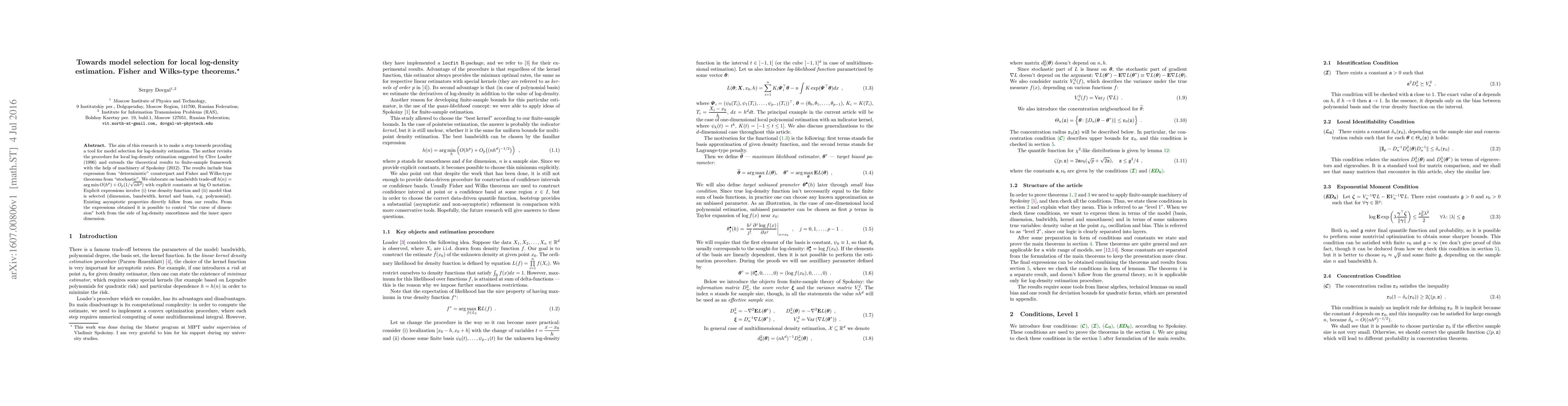 The aim of this research is to make a step towards providing a tool for model selection for log-density estimation. The author revisits the procedure for local log-density estimation suggested by Clive Loader (1996) and extends the theoretical results to finite-sample framework with the help of machinery of Spokoiny (2012). The results include bias expression from "deterministic" counterpart and Fisher and Wilks-type theorems from "stochastic". We elaborate on bandwidth trade-off $ h(n) = \arg\min O(h^p) + O_p(1/\sqrt{nh^d}) $ with explicit constants at big O notation. Explicit expressions involve (i) true density function and (ii) model that is selected (dimension, bandwidth, kernel and basis, e.g. polynomial). Existing asymptotic properties directly follow from our results. From the expressions obtained it is possible to control "the curse of dimension" both from the side of log-density smoothness and the inner space dimension.