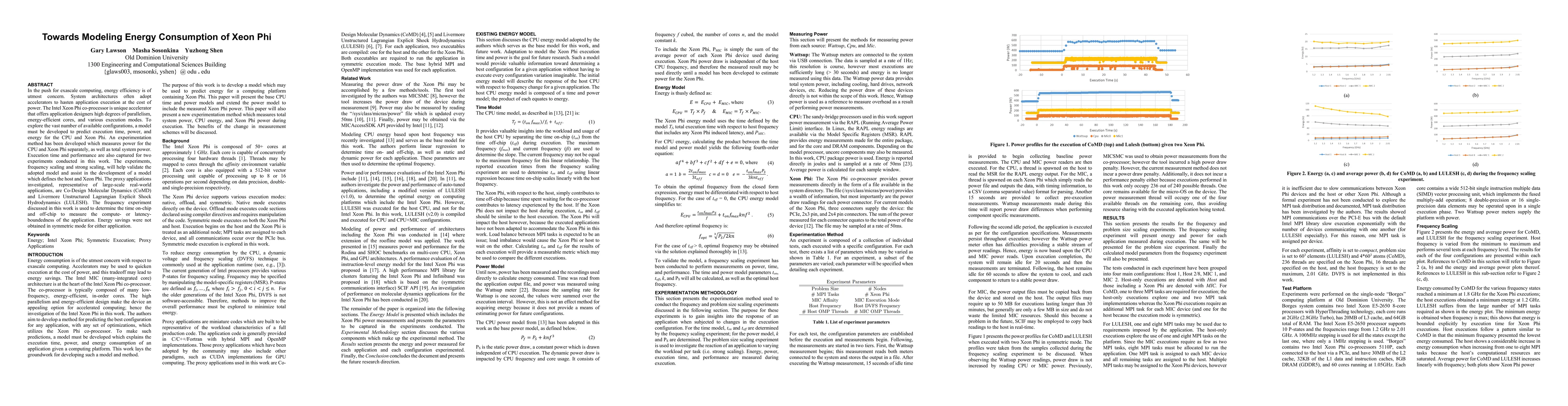 In the push for exascale computing, energy efficiency is of utmost concern. System architectures often adopt accelerators to hasten application execution at the cost of power. The Intel Xeon Phi co-processor is unique accelerator that offers application designers high degrees of parallelism, energy-efficient cores, and various execution modes. To explore the vast number of available configurations, a model must be developed to predict execution time, power, and energy for the CPU and Xeon Phi. An experimentation method has been developed which measures power for the CPU and Xeon Phi separately, as well as total system power. Execution time and performance are also captured for two experiments conducted in this work. The experiments, frequency scaling and strong scaling, will help validate the adopted model and assist in the development of a model which defines the host and Xeon Phi. The proxy applications investigated, representative of large-scale real-world applications, are Co-Design Molecular Dynamics (CoMD) and Livermore Unstructured Lagrangian Explicit Shock Hydrodynamics (LULESH). The frequency experiment discussed in this work is used to determine the time on-chip and off-chip to measure the compute- or latencyboundedness of the application. Energy savings were not obtained in symmetric mode for either application.
