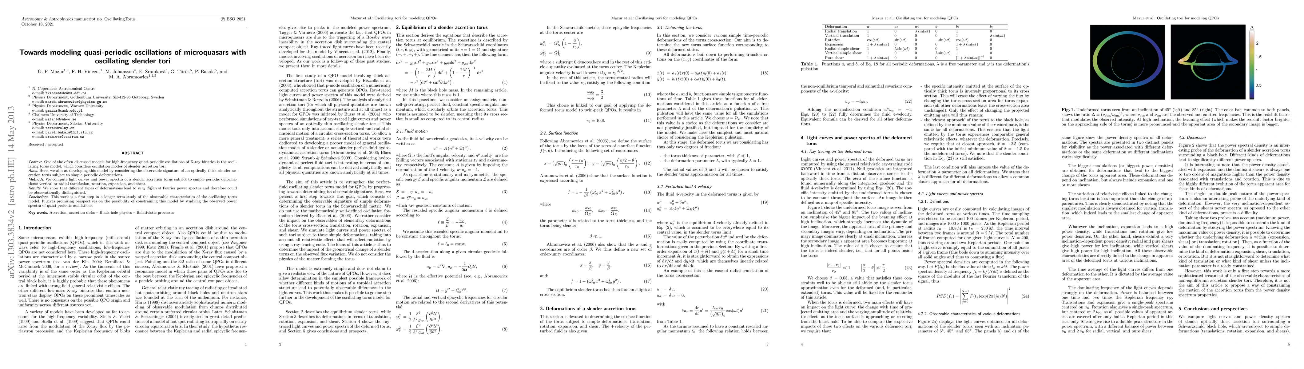 The research computes light curves and power spectra of a slender accretion torus subject to simple periodic deformations such as vertical or radial translation, rotation, expansion, and shear, using a ray-tracing code.