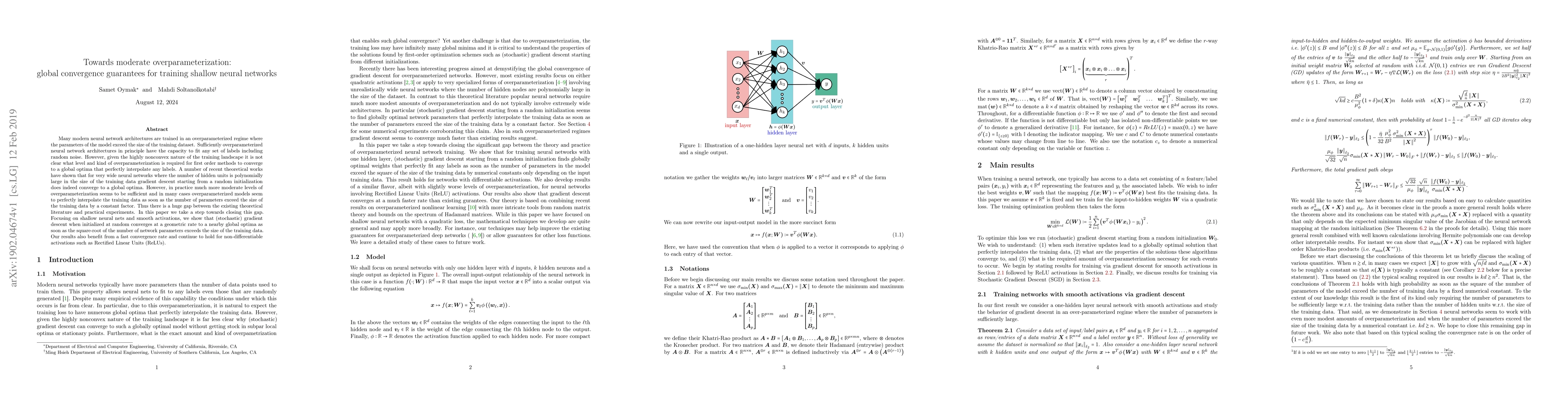 Many modern neural network architectures are trained in an overparameterized regime where the parameters of the model exceed the size of the training dataset. Sufficiently overparameterized neural network architectures in principle have the capacity to fit any set of labels including random noise. However, given the highly nonconvex nature of the training landscape it is not clear what level and kind of overparameterization is required for first order methods to converge to a global optima that perfectly interpolate any labels. A number of recent theoretical works have shown that for very wide neural networks where the number of hidden units is polynomially large in the size of the training data gradient descent starting from a random initialization does indeed converge to a global optima. However, in practice much more moderate levels of overparameterization seems to be sufficient and in many cases overparameterized models seem to perfectly interpolate the training data as soon as the number of parameters exceed the size of the training data by a constant factor. Thus there is a huge gap between the existing theoretical literature and practical experiments. In this paper we take a step towards closing this gap. Focusing on shallow neural nets and smooth activations, we show that (stochastic) gradient descent when initialized at random converges at a geometric rate to a nearby global optima as soon as the square-root of the number of network parameters exceeds the size of the training data. Our results also benefit from a fast convergence rate and continue to hold for non-differentiable activations such as Rectified Linear Units (ReLUs).