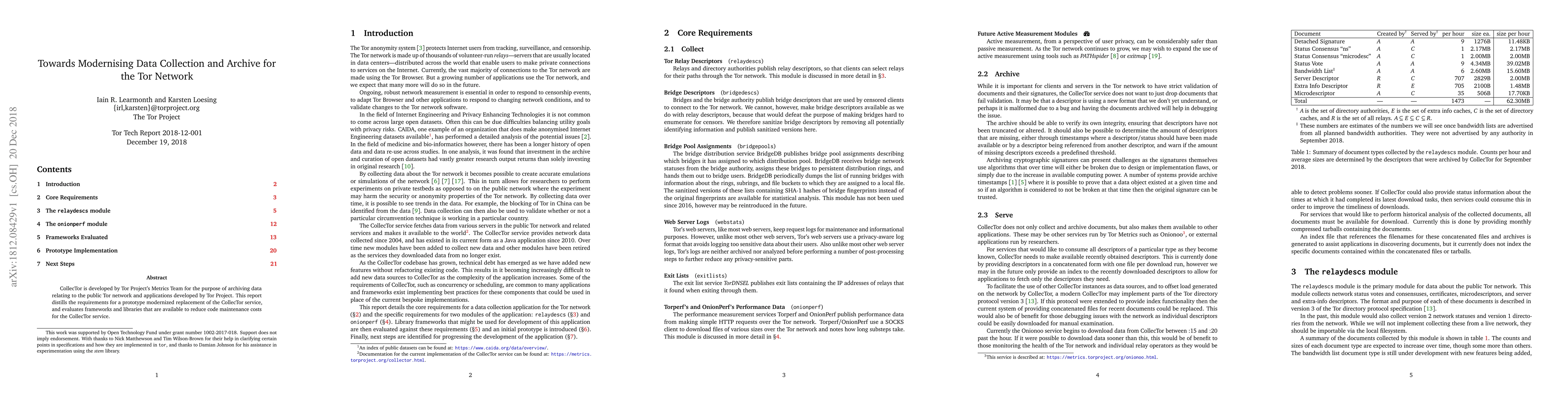 CollecTor, developed by Tor Project's Metrics Team, aims to modernize data collection and archiving for the Tor network. This report outlines the requirements for a new prototype and evaluates frameworks and libraries to minimize maintenance costs for the existing service.