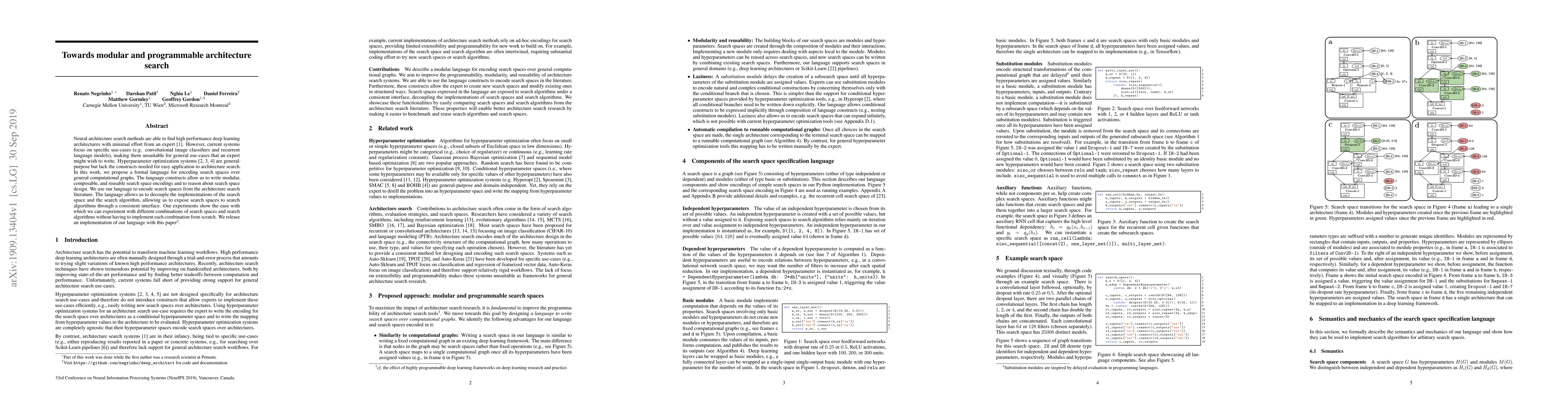 Neural architecture search methods are able to find high performance deep learning architectures with minimal effort from an expert. However, current systems focus on specific use-cases (e.g. convolutional image classifiers and recurrent language models), making them unsuitable for general use-cases that an expert might wish to write. Hyperparameter optimization systems are general-purpose but lack the constructs needed for easy application to architecture search. In this work, we propose a formal language for encoding search spaces over general computational graphs. The language constructs allow us to write modular, composable, and reusable search space encodings and to reason about search space design. We use our language to encode search spaces from the architecture search literature. The language allows us to decouple the implementations of the search space and the search algorithm, allowing us to expose search spaces to search algorithms through a consistent interface. Our experiments show the ease with which we can experiment with different combinations of search spaces and search algorithms without having to implement each combination from scratch. We release an implementation of our language with this paper.