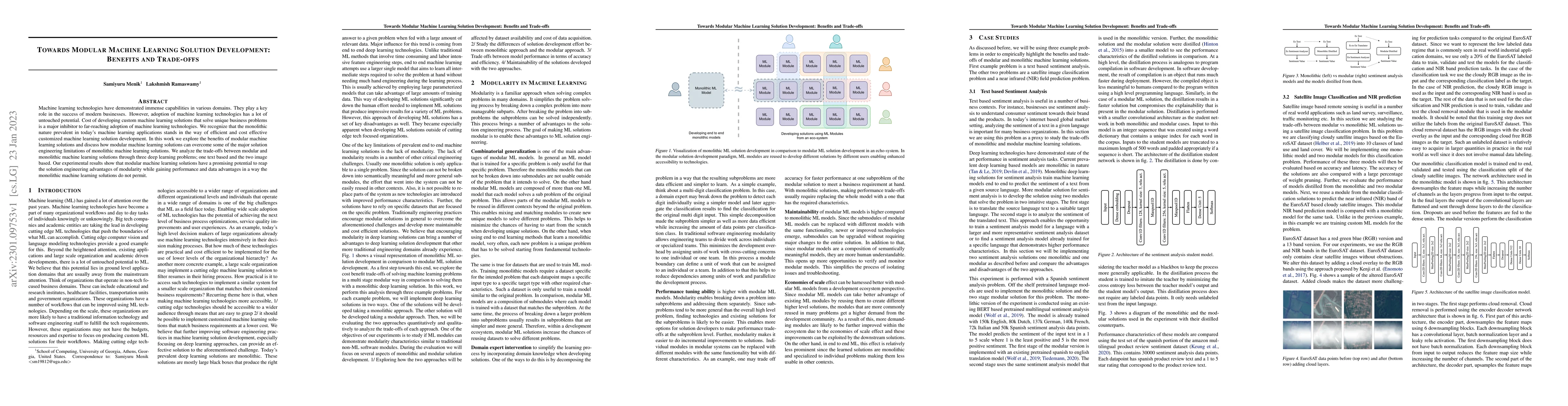 Machine learning technologies have demonstrated immense capabilities in various domains. They play a key role in the success of modern businesses. However, adoption of machine learning technologies has a lot of untouched potential. Cost of developing custom machine learning solutions that solve unique business problems is a major inhibitor to far-reaching adoption of machine learning technologies. We recognize that the monolithic nature prevalent in today's machine learning applications stands in the way of efficient and cost effective customized machine learning solution development. In this work we explore the benefits of modular machine learning solutions and discuss how modular machine learning solutions can overcome some of the major solution engineering limitations of monolithic machine learning solutions. We analyze the trade-offs between modular and monolithic machine learning solutions through three deep learning problems; one text based and the two image based. Our experimental results show that modular machine learning solutions have a promising potential to reap the solution engineering advantages of modularity while gaining performance and data advantages in a way the monolithic machine learning solutions do not permit.