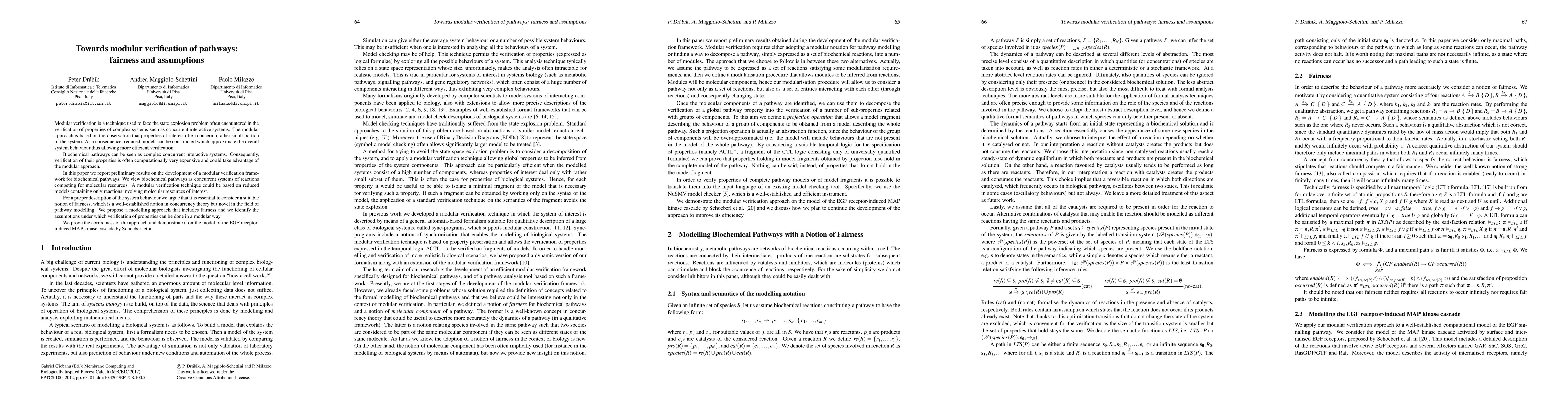 This paper develops a modular verification framework for biochemical pathways, addressing the computational challenges of verifying properties in complex systems. It introduces a notion of fairness and identifies assumptions for effective modular verification, demonstrating the approach with the EGF receptor-induced MAP kinase cascade model.