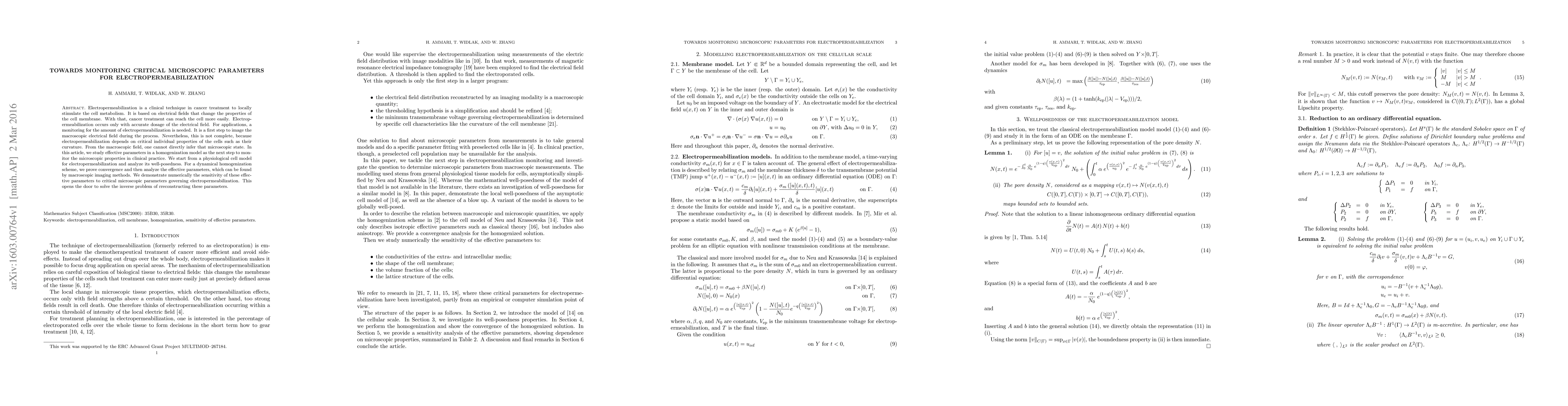 This paper investigates the monitoring of critical microscopic parameters for electropermeabilization, a technique used in cancer treatment, by developing a homogenization model. It demonstrates the sensitivity of effective parameters derived from macroscopic imaging to microscopic cell properties, paving the way for reconstructing these parameters to enhance treatment efficacy.