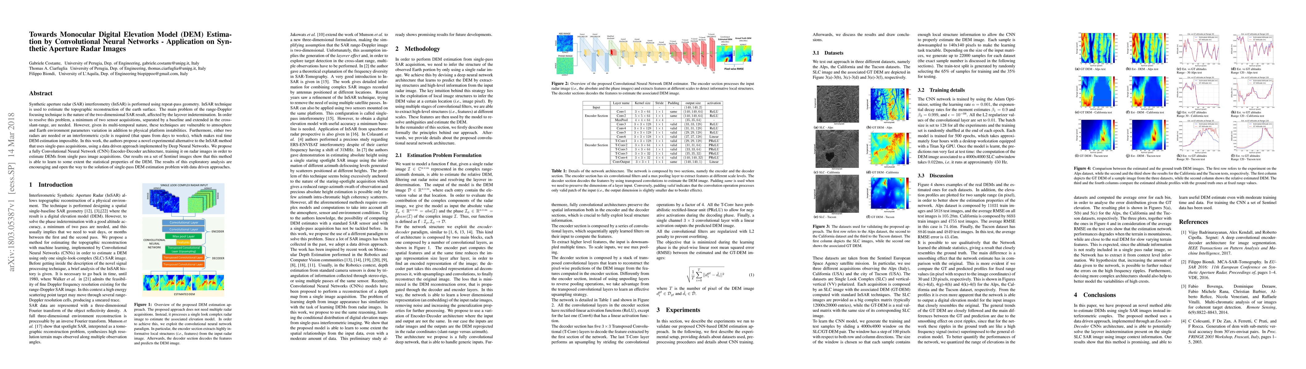 Synthetic aperture radar (SAR) interferometry (InSAR) is performed using repeat-pass geometry. InSAR technique is used to estimate the topographic reconstruction of the earth surface. The main problem of the range-Doppler focusing technique is the nature of the two-dimensional SAR result, affected by the layover indetermination. In order to resolve this problem, a minimum of two sensor acquisitions, separated by a baseline and extended in the cross-slant-range, are needed. However, given its multi-temporal nature, these techniques are vulnerable to atmosphere and Earth environment parameters variation in addition to physical platform instabilities. Furthermore, either two radars are needed or an interferometric cycle is required (that spans from days to weeks), which makes real time DEM estimation impossible. In this work, the authors propose a novel experimental alternative to the InSAR method that uses single-pass acquisitions, using a data driven approach implemented by Deep Neural Networks. We propose a fully Convolutional Neural Network (CNN) Encoder-Decoder architecture, training it on radar images in order to estimate DEMs from single pass image acquisitions. Our results on a set of Sentinel images show that this method is able to learn to some extent the statistical properties of the DEM. The results of this exploratory analysis are encouraging and open the way to the solution of single-pass DEM estimation problem with data driven approaches.
