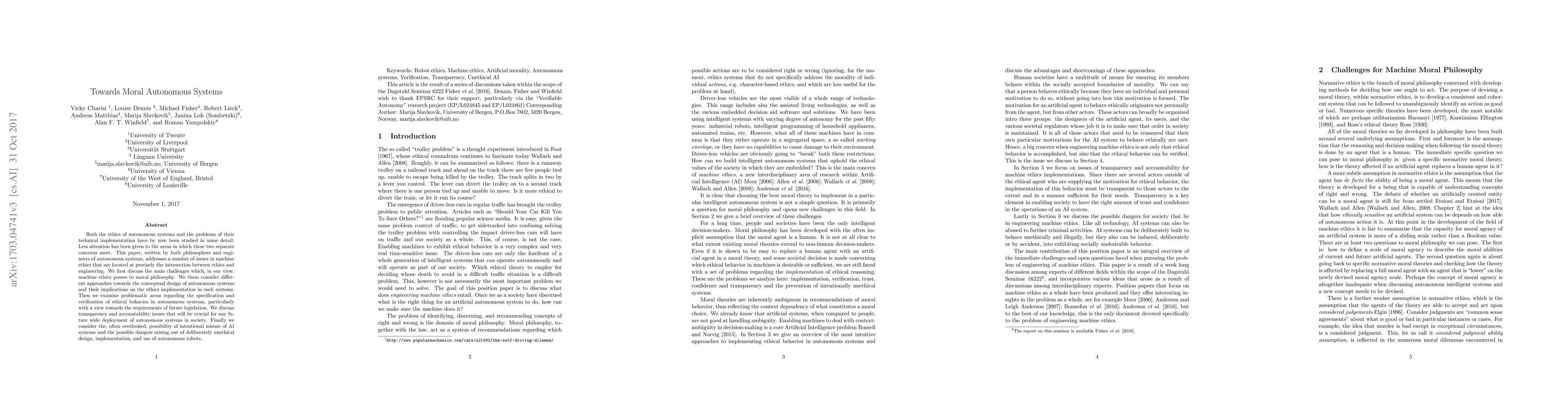 Both the ethics of autonomous systems and the problems of their technical implementation have by now been studied in some detail. Less attention has been given to the areas in which these two separate concerns meet. This paper, written by both philosophers and engineers of autonomous systems, addresses a number of issues in machine ethics that are located at precisely the intersection between ethics and engineering. We first discuss the main challenges which, in our view, machine ethics posses to moral philosophy. We them consider different approaches towards the conceptual design of autonomous systems and their implications on the ethics implementation in such systems. Then we examine problematic areas regarding the specification and verification of ethical behavior in autonomous systems, particularly with a view towards the requirements of future legislation. We discuss transparency and accountability issues that will be crucial for any future wide deployment of autonomous systems in society. Finally we consider the, often overlooked, possibility of intentional misuse of AI systems and the possible dangers arising out of deliberately unethical design, implementation, and use of autonomous robots.