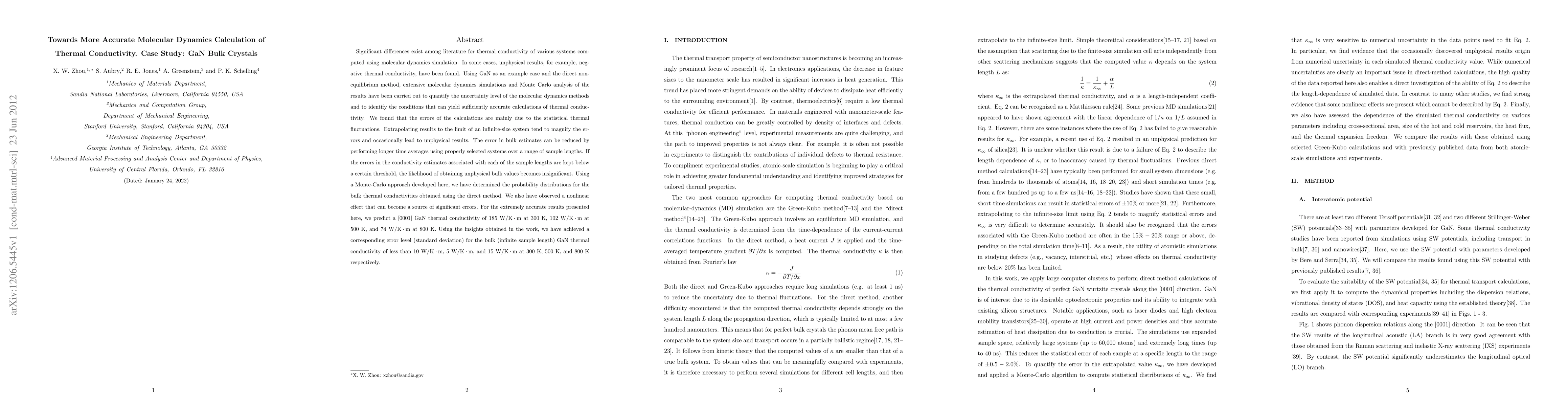 This paper investigates the accuracy of molecular dynamics simulations for calculating thermal conductivity in GaN bulk crystals, identifying statistical fluctuations and system size effects as primary sources of error. The study achieves a thermal conductivity of 185, 102, and 74 W/K·m for GaN at 300, 500, and 800 K, respectively, with error margins below 10, 5, and 15 W/K·m.