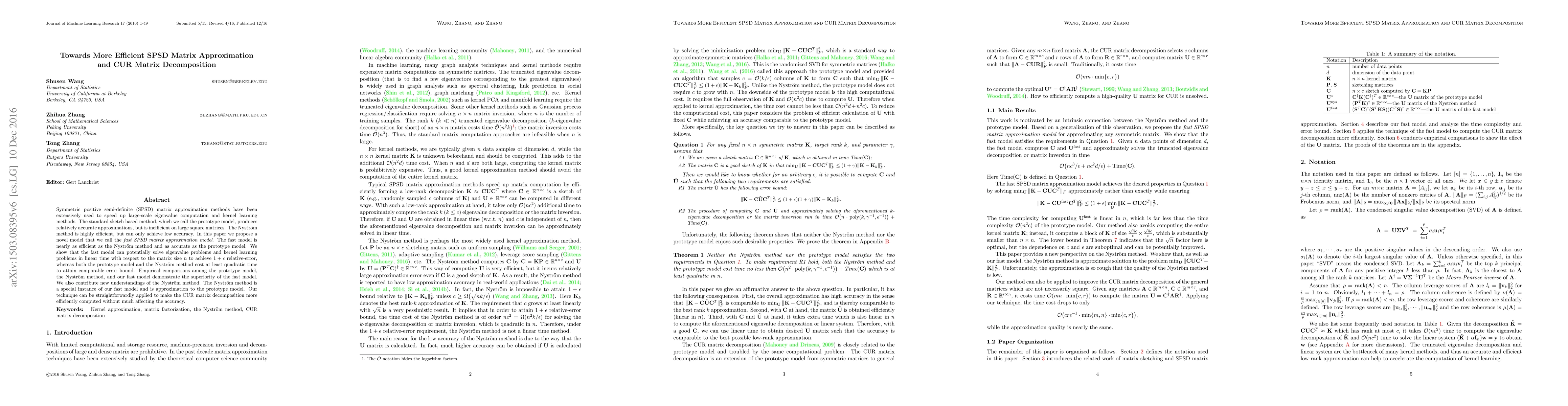 This paper introduces a novel "fast SPSD matrix approximation model" that efficiently approximates symmetric positive semi-definite matrices, achieving near-Nyström efficiency and prototype accuracy. It demonstrates linear time complexity for solving eigenvalue problems and kernel learning, outperforming existing methods.