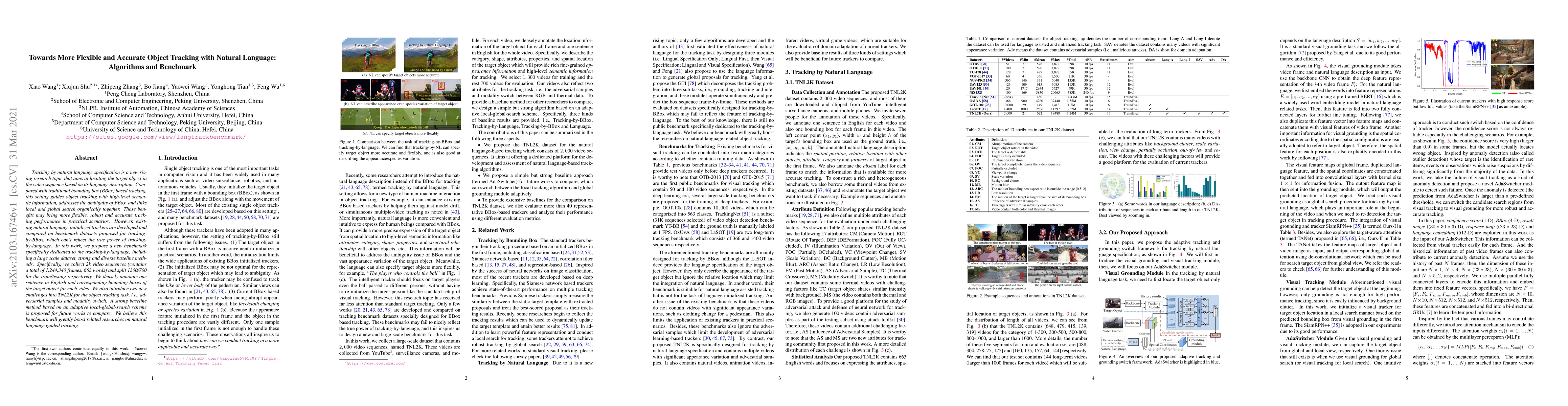 Tracking by natural language specification is a new rising research topic that aims at locating the target object in the video sequence based on its language description. Compared with traditional bounding box (BBox) based tracking, this setting guides object tracking with high-level semantic information, addresses the ambiguity of BBox, and links local and global search organically together. Those benefits may bring more flexible, robust and accurate tracking performance in practical scenarios. However, existing natural language initialized trackers are developed and compared on benchmark datasets proposed for tracking-by-BBox, which can't reflect the true power of tracking-by-language. In this work, we propose a new benchmark specifically dedicated to the tracking-by-language, including a large scale dataset, strong and diverse baseline methods. Specifically, we collect 2k video sequences (contains a total of 1,244,340 frames, 663 words) and split 1300/700 for the train/testing respectively. We densely annotate one sentence in English and corresponding bounding boxes of the target object for each video. We also introduce two new challenges into TNL2K for the object tracking task, i.e., adversarial samples and modality switch. A strong baseline method based on an adaptive local-global-search scheme is proposed for future works to compare. We believe this benchmark will greatly boost related researches on natural language guided tracking.