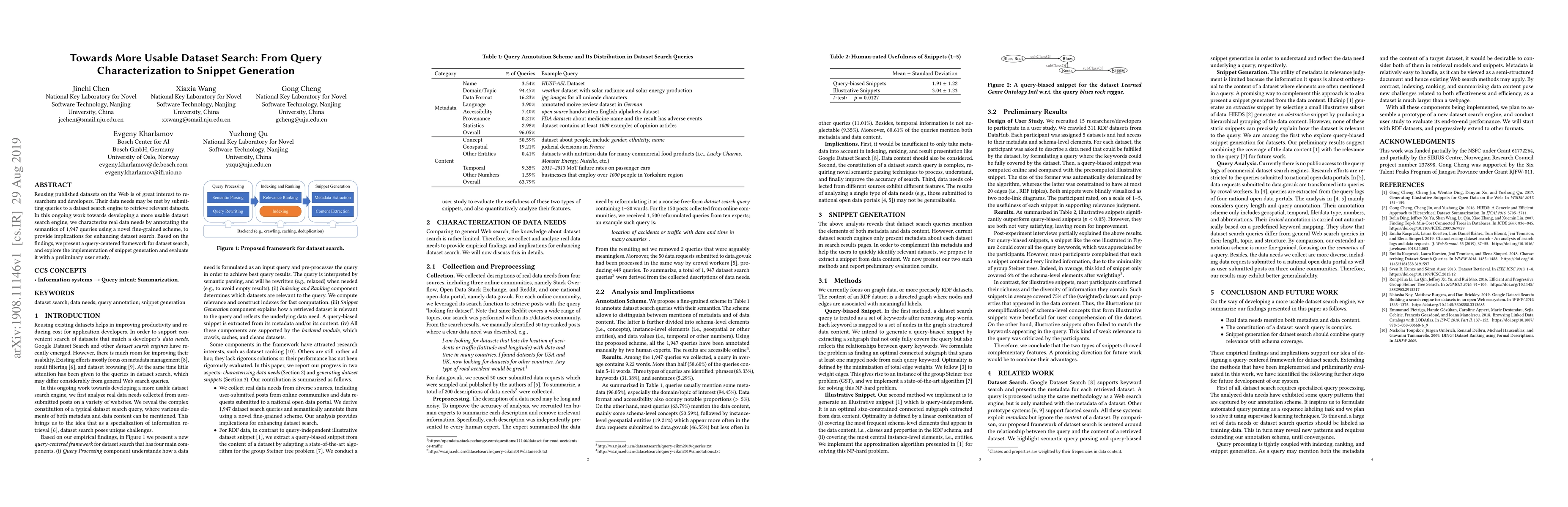 This paper characterizes the semantics of 1,947 dataset search queries using a novel scheme to enhance dataset search usability, and proposes a framework for snippet generation, evaluated in a preliminary user study.