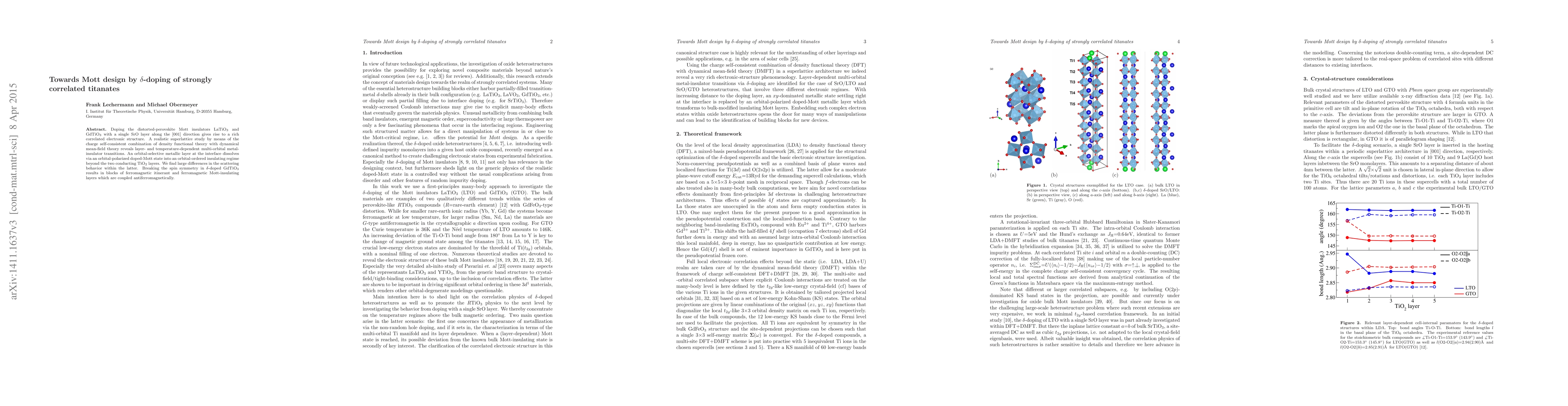 Doping the distorted-perovskite Mott insulators LaTiO$_3$ and GdTiO$_3$ with a single SrO layer along the [001] direction gives rise to a rich correlated electronic structure. A realistic superlattice study by means of the charge self-consistent combination of density functional theory with dynamical mean-field theory reveals layer- and temperature-dependent multi-orbital metal-insulator transitions. An orbital-selective metallic layer at the interface dissolves via an orbital-polarized doped-Mott state into an orbital-ordered insulating regime beyond the two conducting TiO$_2$ layers. We find large differences in the scattering behavior within the latter. Breaking the spin symmetry in $\delta$-doped GdTiO$_3$ results in blocks of ferromagnetic itinerant and ferromagnetic Mott-insulating layers which are coupled antiferromagnetically.