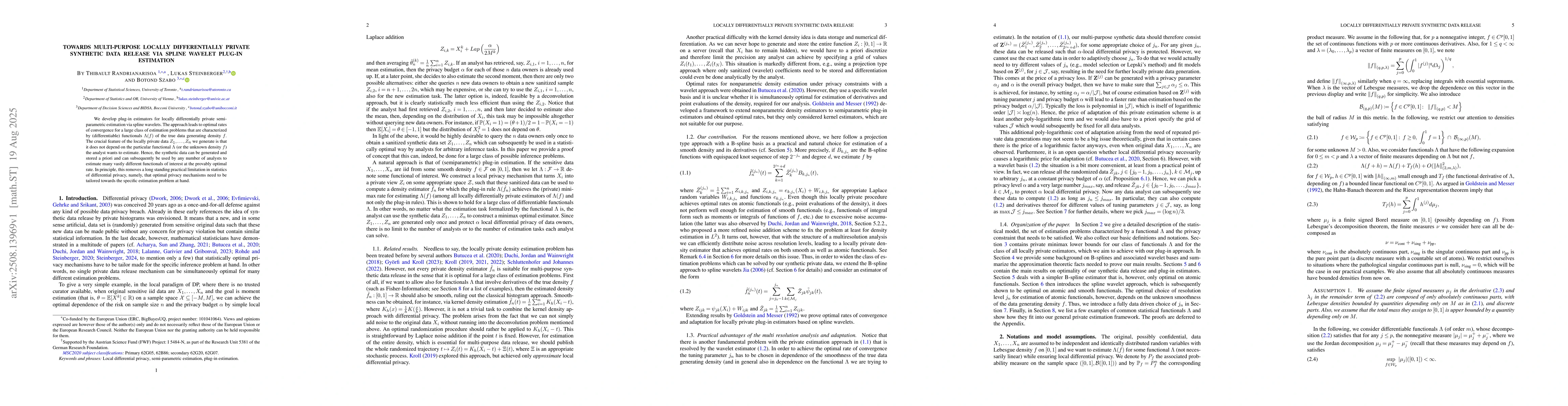 We develop plug-in estimators for locally differentially private semi-parametric estimation via spline wavelets. The approach leads to optimal rates of convergence for a large class of estimation problems that are characterized by (differentiable) functionals $\Lambda(f)$ of the true data generating density $f$. The crucial feature of the locally private data $Z_1,\dots, Z_n$ we generate is that it does not depend on the particular functional $\Lambda$ (or the unknown density $f$) the analyst wants to estimate. Hence, the synthetic data can be generated and stored a priori and can subsequently be used by any number of analysts to estimate many vastly different functionals of interest at the provably optimal rate. In principle, this removes a long standing practical limitation in statistics of differential privacy, namely, that optimal privacy mechanisms need to be tailored towards the specific estimation problem at hand.