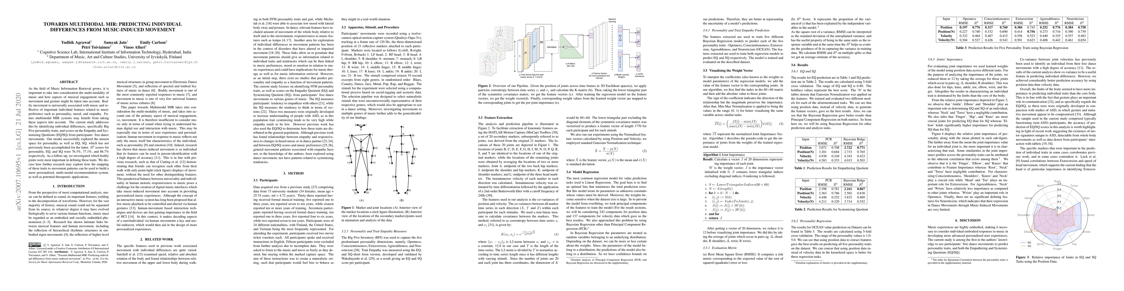 This study explores the relationship between music-induced movement and individual differences, specifically the Big Five personality traits and Empathy and Systemizing Quotients, using free dance movements. The model achieved high R2 scores for predicting these traits, indicating potential for personalized, multi-modal music recommendation systems and therapeutic applications.