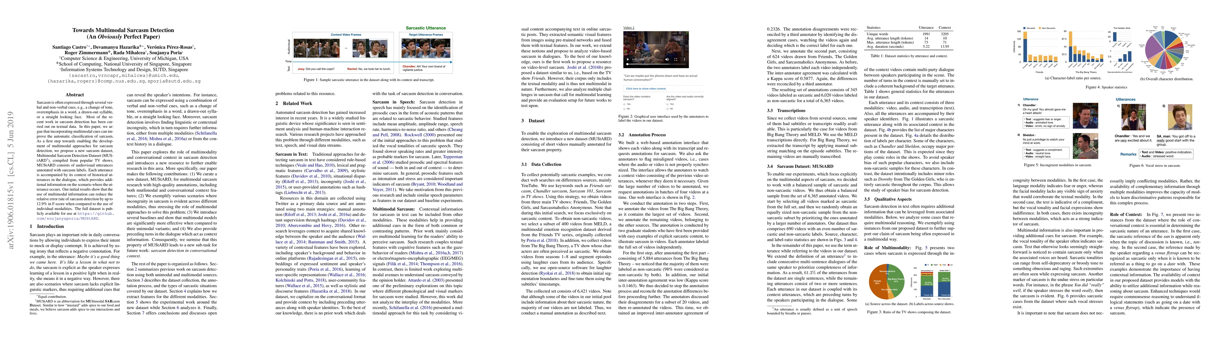 Sarcasm is often expressed through several verbal and non-verbal cues, e.g., a change of tone, overemphasis in a word, a drawn-out syllable, or a straight looking face. Most of the recent work in sarcasm detection has been carried out on textual data. In this paper, we argue that incorporating multimodal cues can improve the automatic classification of sarcasm. As a first step towards enabling the development of multimodal approaches for sarcasm detection, we propose a new sarcasm dataset, Multimodal Sarcasm Detection Dataset (MUStARD), compiled from popular TV shows. MUStARD consists of audiovisual utterances annotated with sarcasm labels. Each utterance is accompanied by its context of historical utterances in the dialogue, which provides additional information on the scenario where the utterance occurs. Our initial results show that the use of multimodal information can reduce the relative error rate of sarcasm detection by up to 12.9% in F-score when compared to the use of individual modalities. The full dataset is publicly available for use at https://github.com/soujanyaporia/MUStARD