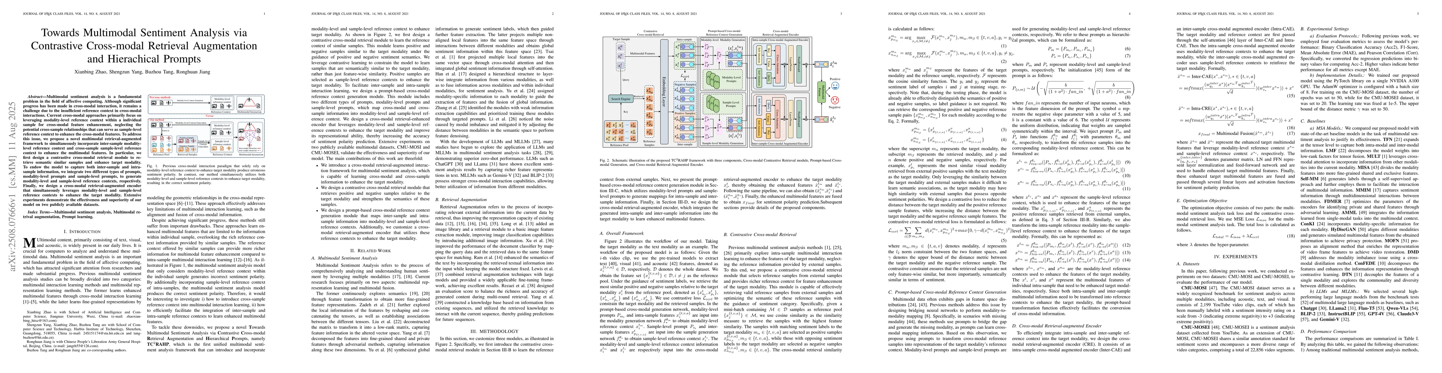 The paper proposes a multimodal retrieval-enhanced framework for multimodal sentiment analysis tasks, integrating external samples via a retrieval mechanism to enhance modalities. It introduces a cross-modal contrastive retrieval module, modality-level and sample-level prompts, and a cross-modal retrieval-augmented encoder.