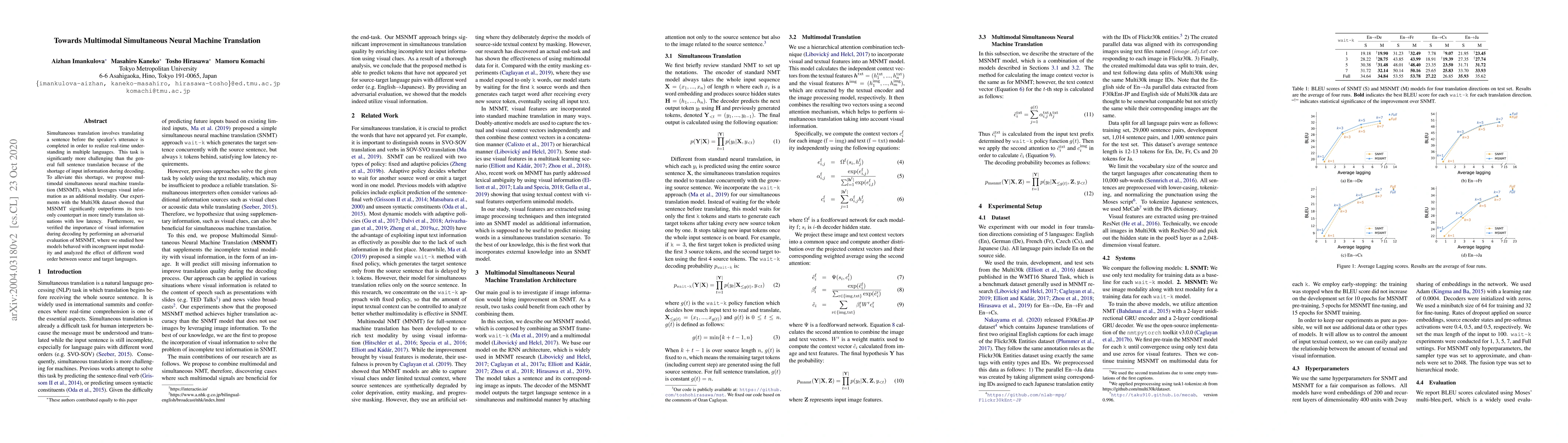 This paper proposes multimodal simultaneous neural machine translation (MSNMT) to enhance real-time translation by incorporating visual information. Experiments on the Multi30k dataset demonstrate that MSNMT achieves better performance than text-only models, especially in low-latency scenarios, highlighting the importance of visual data during decoding.