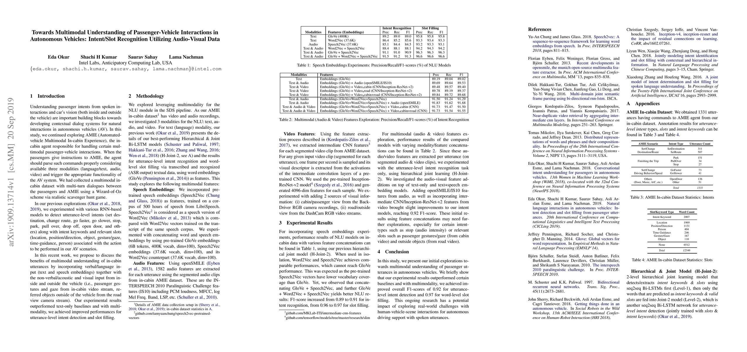 This paper explores multimodal understanding of passenger-vehicle interactions in autonomous vehicles using audio-visual data to recognize passenger intents and slots. The study combines language, audio, and visual inputs to improve intent detection and slot filling, achieving better results than text-only models.