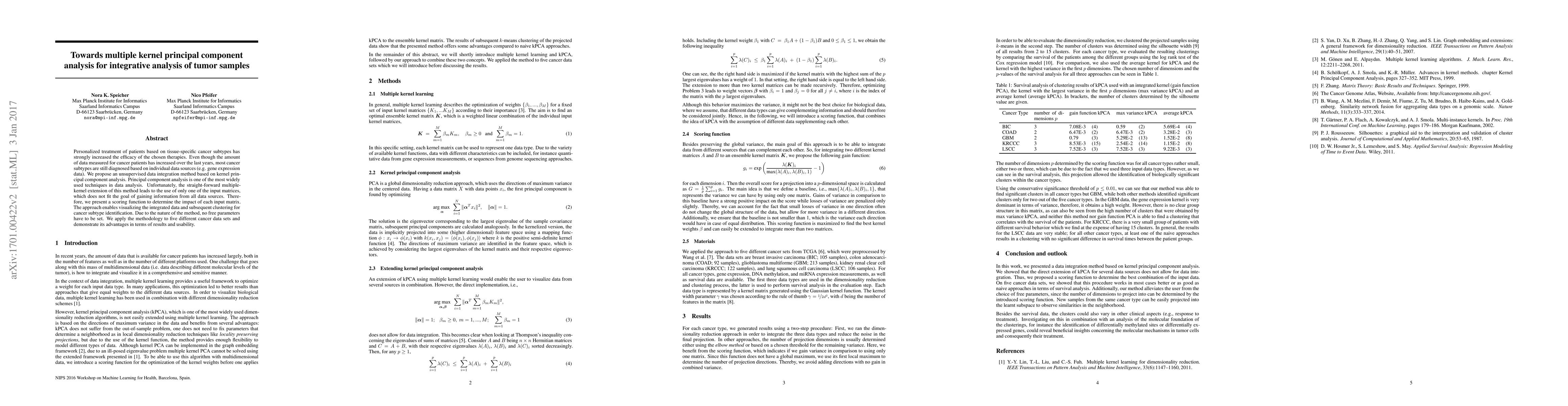 Personalized treatment of patients based on tissue-specific cancer subtypes has strongly increased the efficacy of the chosen therapies. Even though the amount of data measured for cancer patients has increased over the last years, most cancer subtypes are still diagnosed based on individual data sources (e.g. gene expression data). We propose an unsupervised data integration method based on kernel principal component analysis. Principal component analysis is one of the most widely used techniques in data analysis. Unfortunately, the straight-forward multiple-kernel extension of this method leads to the use of only one of the input matrices, which does not fit the goal of gaining information from all data sources. Therefore, we present a scoring function to determine the impact of each input matrix. The approach enables visualizing the integrated data and subsequent clustering for cancer subtype identification. Due to the nature of the method, no free parameters have to be set. We apply the methodology to five different cancer data sets and demonstrate its advantages in terms of results and usability.