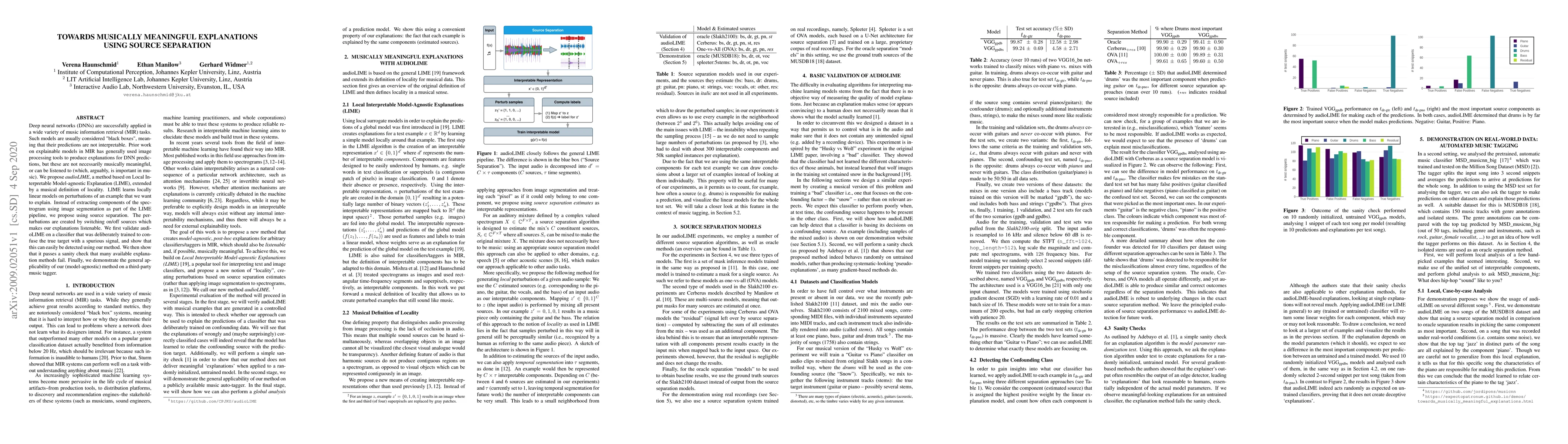 This paper introduces audioLIME, a method for generating musically meaningful explanations for deep neural network predictions in music information retrieval tasks. Unlike previous methods that use image processing tools, audioLIME employs source separation to create listenable perturbations, validating its effectiveness on a confusing classifier and a third-party music tagger, while passing sanity checks.