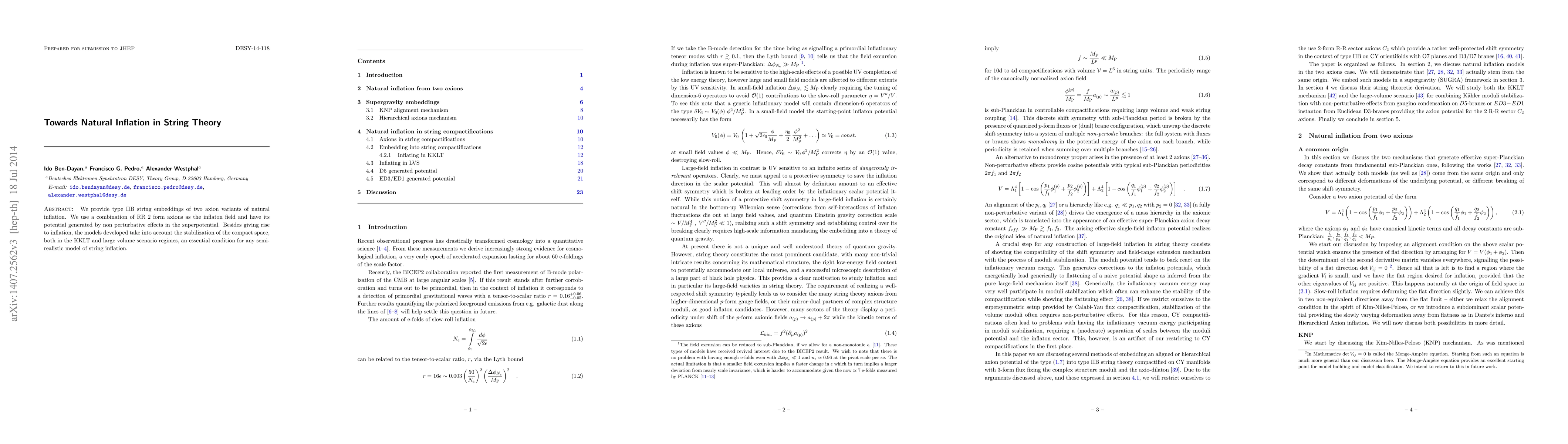 This paper presents type IIB string theory models for two variants of natural inflation, utilizing RR 2 form axions as the inflaton field, with potential generated by non-perturbative effects. It also stabilizes the compact space in both KKLT and large volume scenarios, crucial for realistic string inflation models.