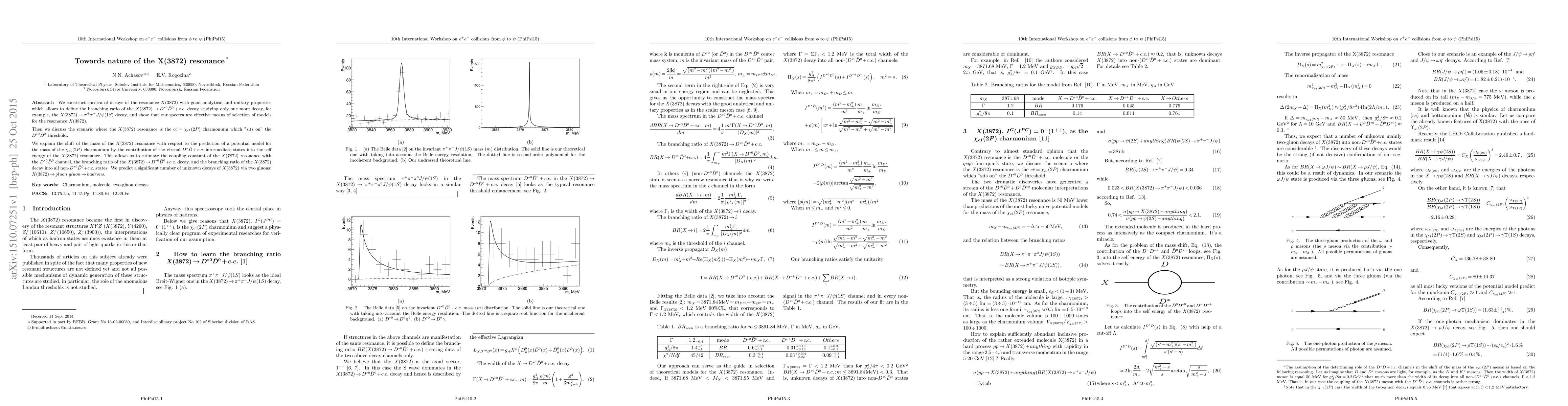 This paper constructs decay spectra for the X(3872) resonance, demonstrating effective model selection and estimating its coupling constants and branching ratios. The authors propose that X(3872) may be the charmonium state χ_{c1}(2P) near the D^{*0}\bar D^0 threshold, explaining the mass shift due to virtual D^*\bar D intermediate states.