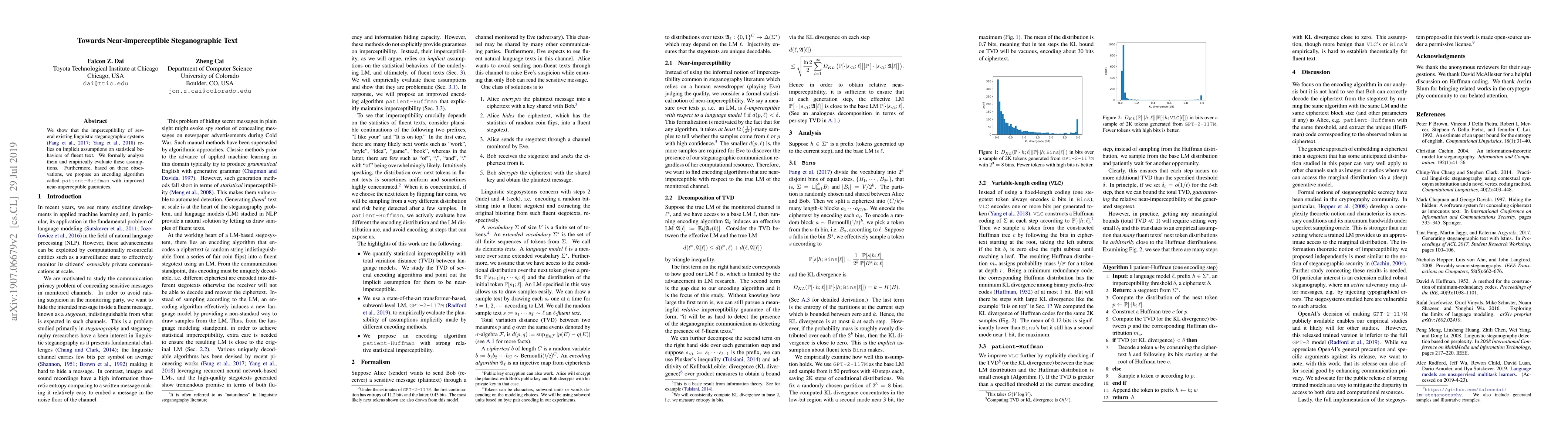 Researchers analyze existing linguistic steganographic systems and propose a new encoding algorithm called patient-Huffman that provides near-imperceptible guarantees.