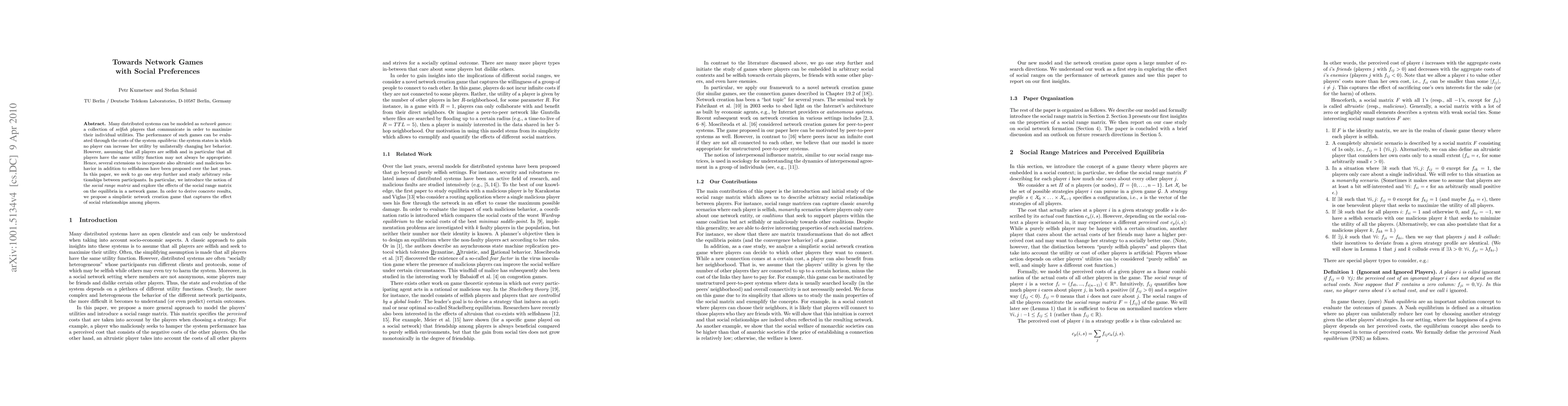 This paper explores extending network game models to include social preferences beyond selfishness, introducing the social range matrix to represent relationships among players. It proposes a network creation game to demonstrate how social relationships influence equilibria in network games.