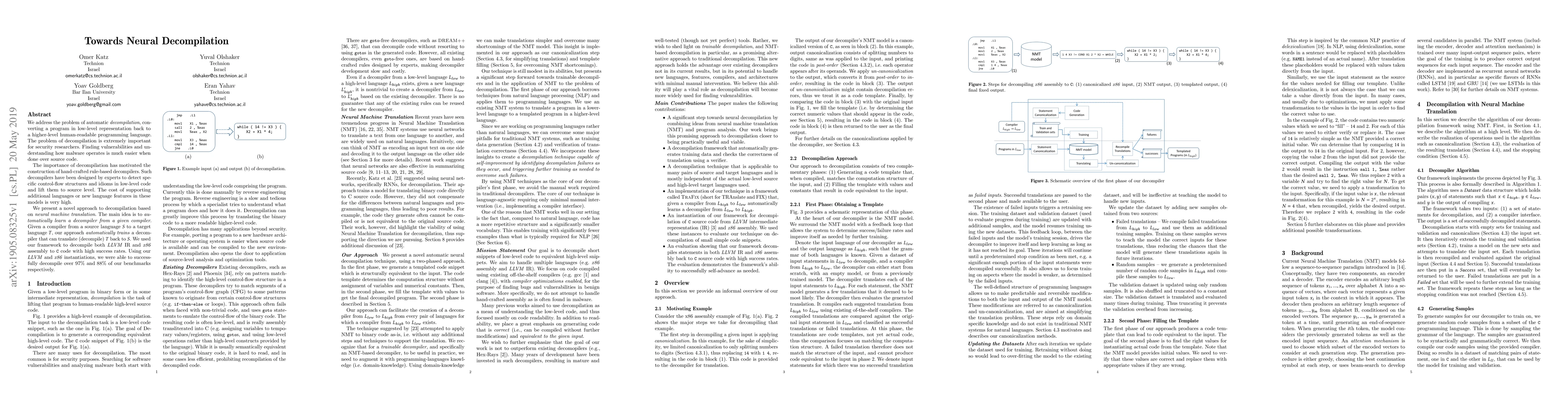 We address the problem of automatic decompilation, converting a program in low-level representation back to a higher-level human-readable programming language. The problem of decompilation is extremely important for security researchers. Finding vulnerabilities and understanding how malware operates is much easier when done over source code. The importance of decompilation has motivated the construction of hand-crafted rule-based decompilers. Such decompilers have been designed by experts to detect specific control-flow structures and idioms in low-level code and lift them to source level. The cost of supporting additional languages or new language features in these models is very high. We present a novel approach to decompilation based on neural machine translation. The main idea is to automatically learn a decompiler from a given compiler. Given a compiler from a source language S to a target language T , our approach automatically trains a decompiler that can translate (decompile) T back to S . We used our framework to decompile both LLVM IR and x86 assembly to C code with high success rates. Using our LLVM and x86 instantiations, we were able to successfully decompile over 97% and 88% of our benchmarks respectively.