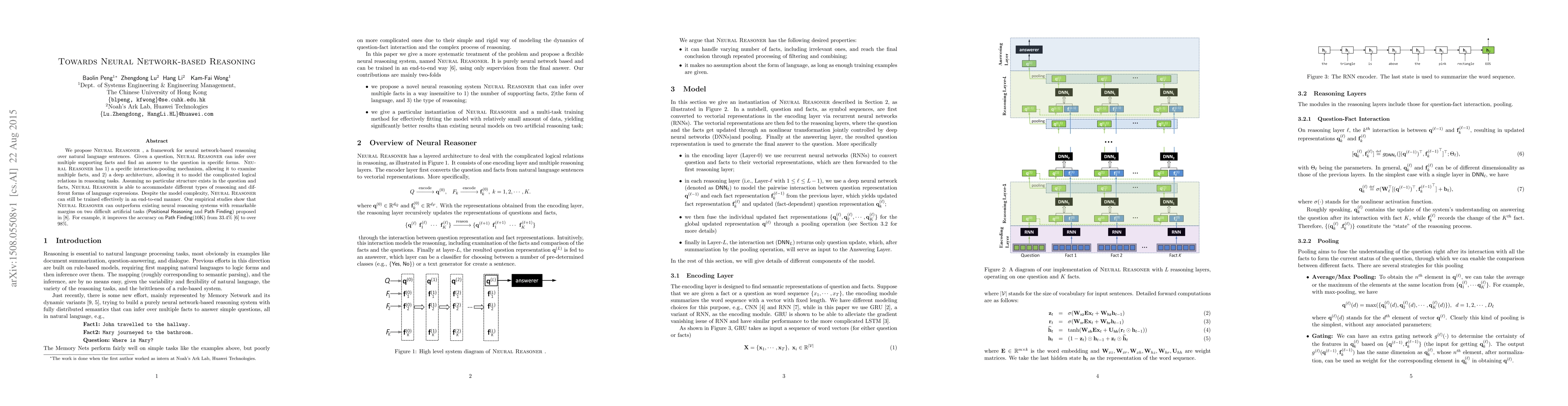 This paper introduces Neural Reasoner, a framework for neural network-based reasoning over natural language sentences, featuring an interaction-pooling mechanism and deep architecture to model complex logical relations. Empirical studies show it outperforms existing systems on difficult tasks like Positional Reasoning and Path Finding.