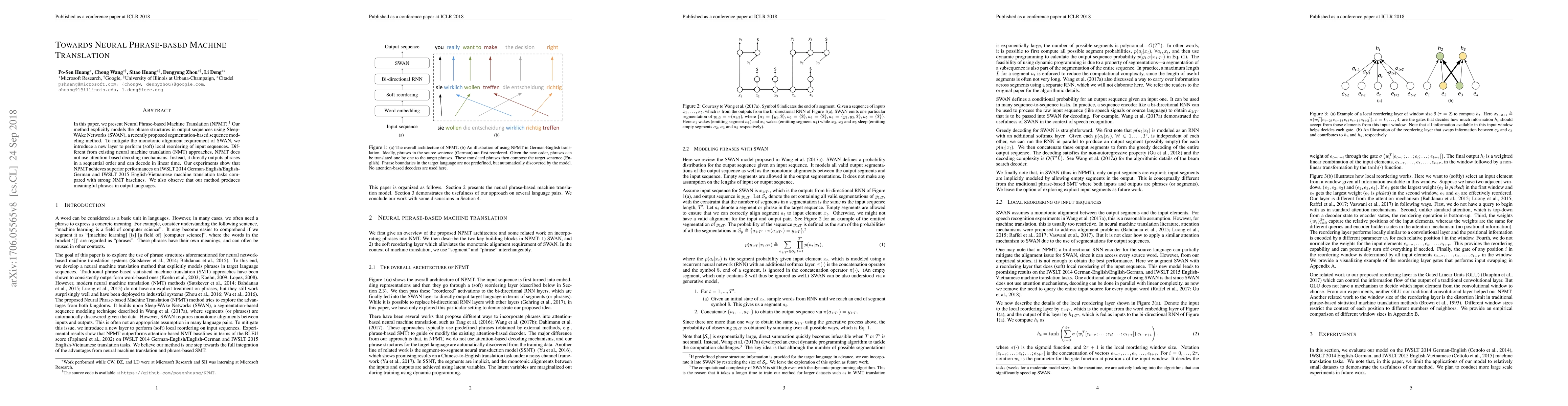 This paper introduces Neural Phrase-based Machine Translation (NPMT), which uses Sleep-WAke Networks (SWAN) to model phrase structures and employs a local reordering layer to address alignment issues. Unlike traditional NMT, NPMT outputs phrases sequentially in linear time, achieving better performance on IWSLT tasks compared to NMT baselines.