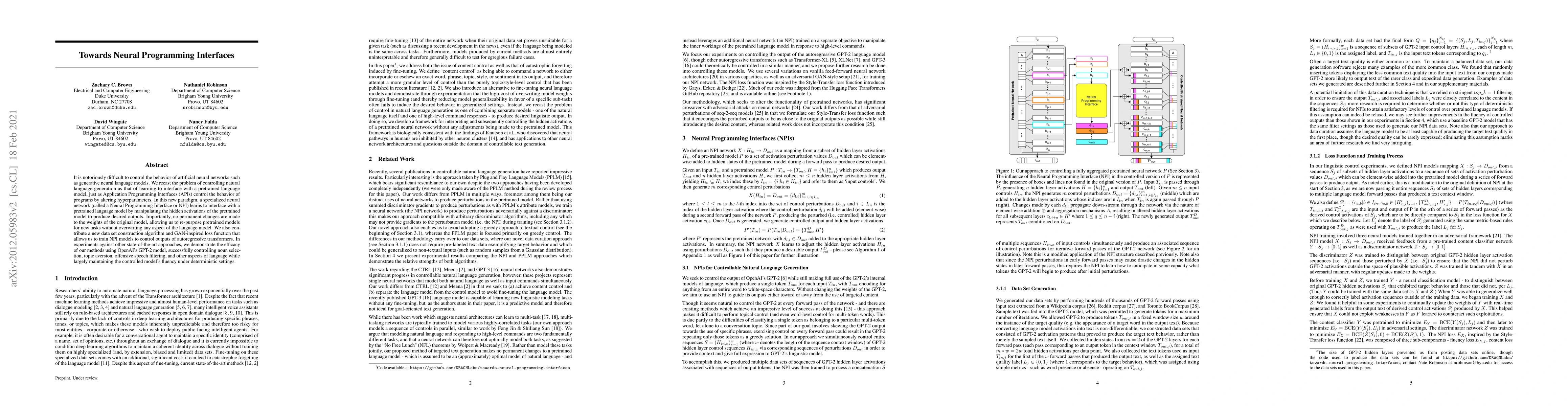 This paper proposes Neural Programming Interfaces (NPIs) to control the behavior of generative neural language models without altering the original model's weights. NPIs manipulate hidden activations to achieve desired outputs, demonstrating effectiveness in controlling aspects like noun selection and offensive speech filtering using pretrained models like GPT-2.