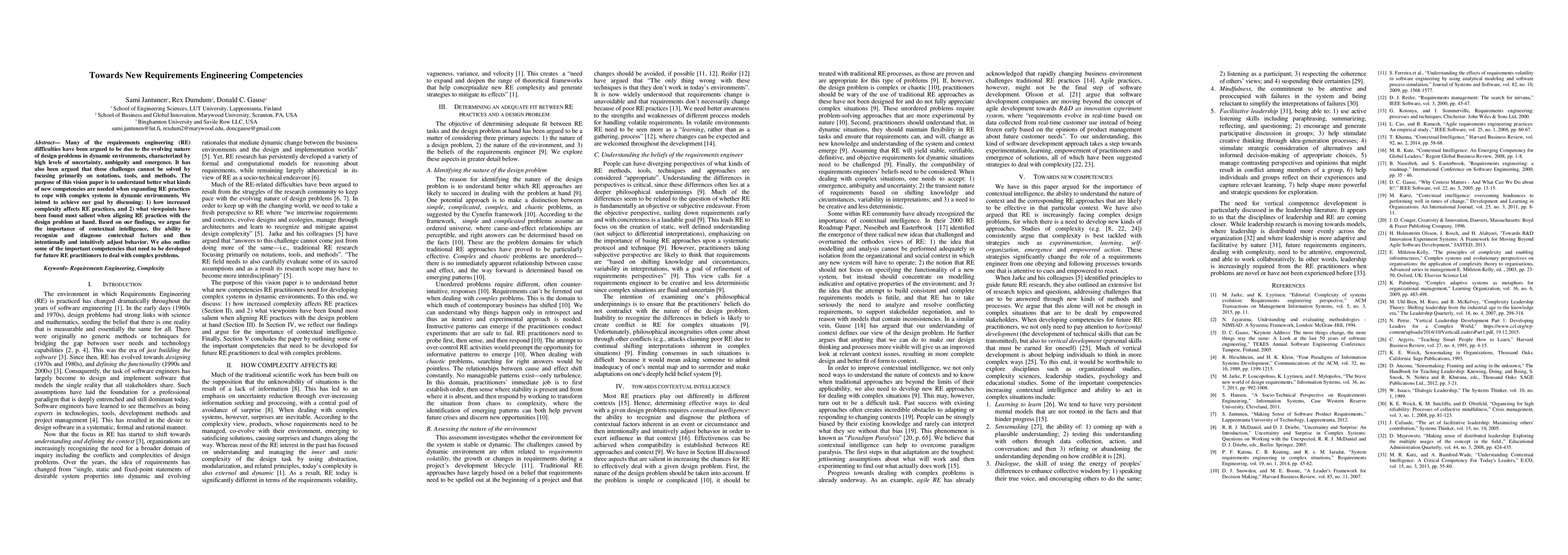 Many of the requirements engineering (RE) difficulties have been argued to be due to the evolving nature of design problems in dynamic environments, characterized by high levels of uncertainty, ambiguity and emergence. It has also been argued that these challenges cannot be solved by focusing primarily on notations, tools, and methods. The purpose of this vision paper is to understand better what kinds of new competencies are needed when expanding RE practices to cope with complex systems in dynamic environments. We intend to achieve our goal by discussing: 1) how increased complexity affects RE practices, and 2) what viewpoints have been found most salient when aligning RE practices with the design problem at hand. Based on our findings, we argue for the importance of contextual intelligence, the ability to recognize and diagnose contextual factors and then intentionally and intuitively adjust behavior. We also outline some of the important competencies that need to be developed for future RE practitioners to deal with complex problems.
