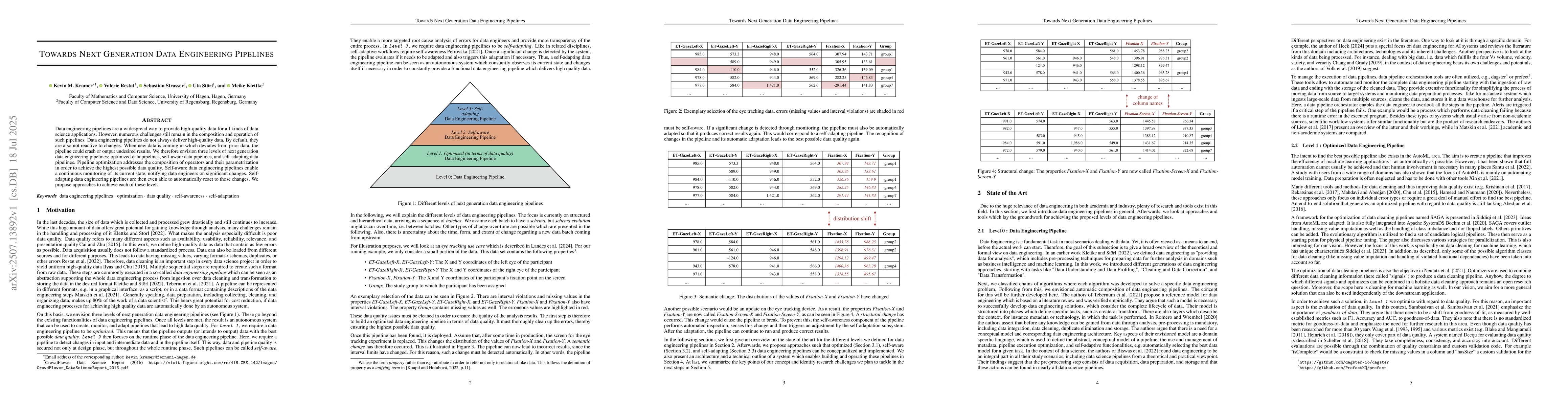 Data engineering pipelines are a widespread way to provide high-quality data for all kinds of data science applications. However, numerous challenges still remain in the composition and operation of such pipelines. Data engineering pipelines do not always deliver high-quality data. By default, they are also not reactive to changes. When new data is coming in which deviates from prior data, the pipeline could crash or output undesired results. We therefore envision three levels of next generation data engineering pipelines: optimized data pipelines, self-aware data pipelines, and self-adapting data pipelines. Pipeline optimization addresses the composition of operators and their parametrization in order to achieve the highest possible data quality. Self-aware data engineering pipelines enable a continuous monitoring of its current state, notifying data engineers on significant changes. Self-adapting data engineering pipelines are then even able to automatically react to those changes. We propose approaches to achieve each of these levels.