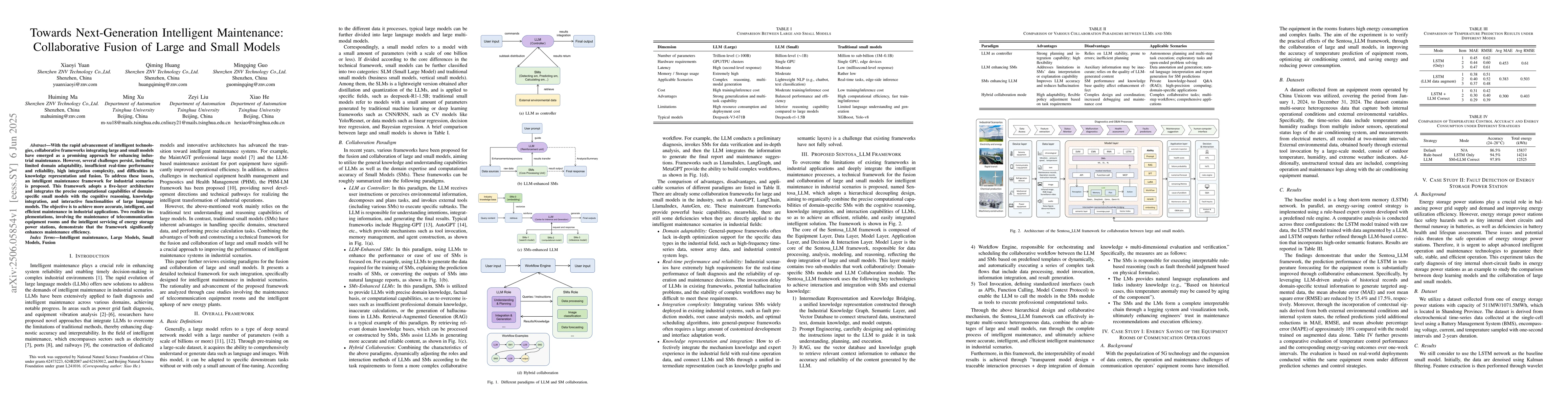 With the rapid advancement of intelligent technologies, collaborative frameworks integrating large and small models have emerged as a promising approach for enhancing industrial maintenance. However, several challenges persist, including limited domain adaptability, insufficient real-time performance and reliability, high integration complexity, and difficulties in knowledge representation and fusion. To address these issues, an intelligent maintenance framework for industrial scenarios is proposed. This framework adopts a five-layer architecture and integrates the precise computational capabilities of domain-specific small models with the cognitive reasoning, knowledge integration, and interactive functionalities of large language models. The objective is to achieve more accurate, intelligent, and efficient maintenance in industrial applications. Two realistic implementations, involving the maintenance of telecommunication equipment rooms and the intelligent servicing of energy storage power stations, demonstrate that the framework significantly enhances maintenance efficiency.