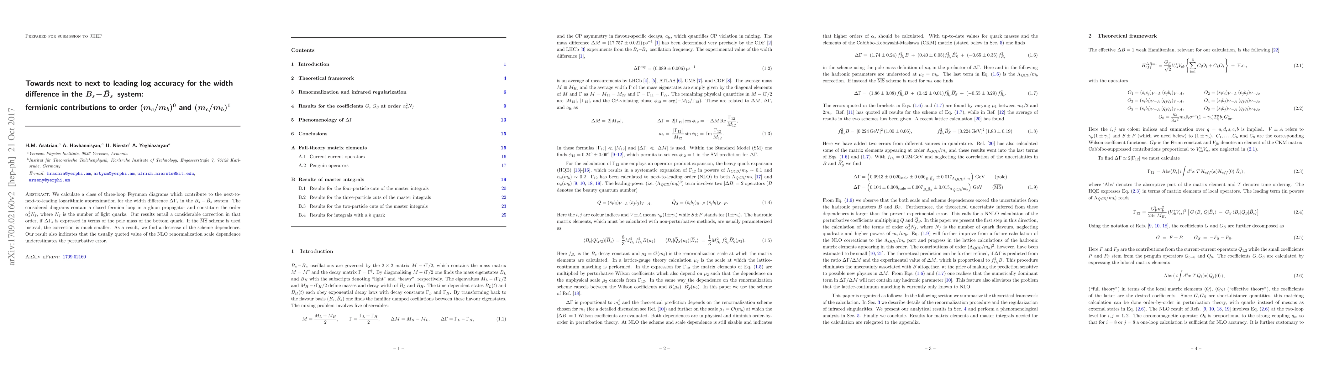 We calculate a class of three-loop Feynman diagrams which contribute to the next-to-next-to-leading logarithmic approximation for the width difference $\Delta\Gamma_{s}$ in the $B_s-\bar{B}_s$ system. The considered diagrams contain a closed fermion loop in a gluon propagator and constitute the order $\alpha_s^2 N_f$, where $N_f$ is the number of light quarks. Our results entail a considerable correction in that order, if $\Delta\Gamma_{s}$ is expressed in terms of the pole mass of the bottom quark. If the $\overline{MS}$ scheme is used instead, the correction is much smaller. As a result, we find a decrease of the scheme dependence. Our result also indicates that the usually quoted value of the NLO renormalization scale dependence underestimates the perturbative error.