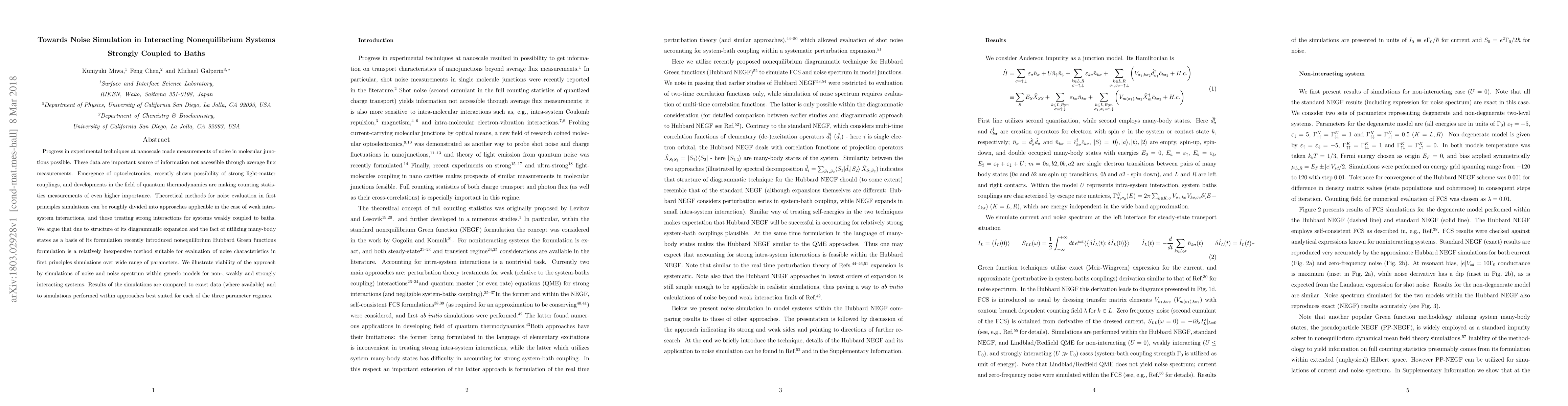 This paper proposes the nonequilibrium Hubbard Green functions method for evaluating noise characteristics in first principles simulations of interacting nonequilibrium systems strongly coupled to baths. The method is shown to be effective across a wide range of interaction strengths and is validated through comparisons with exact data and other established approaches.