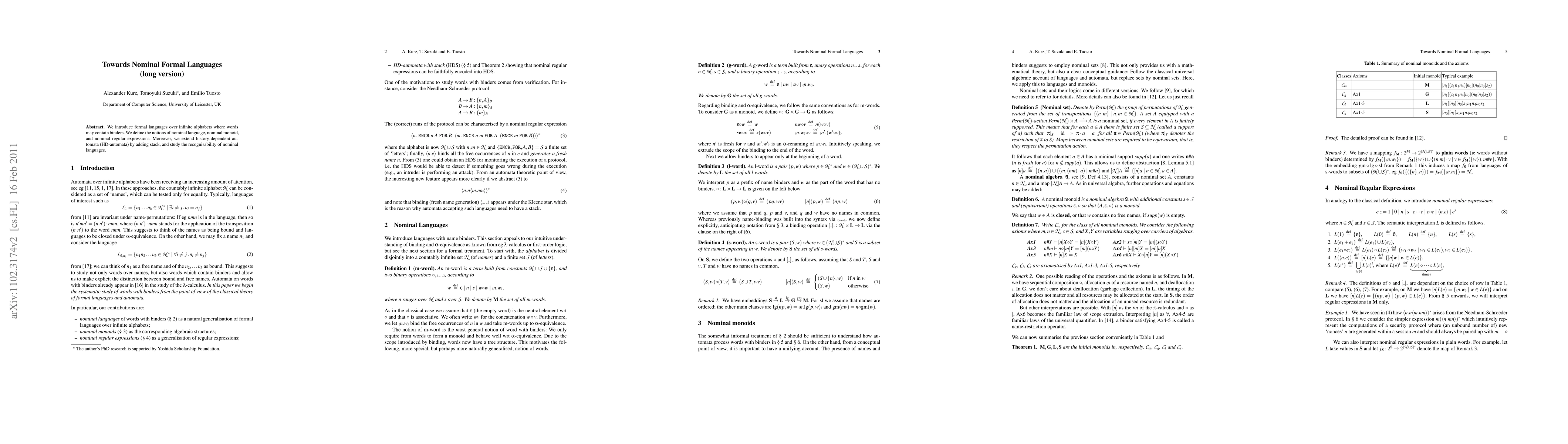 This paper introduces formal languages with binders over infinite alphabets, defining nominal languages, nominal monoids, and nominal regular expressions. It extends history-dependent automata with stacks and investigates the recognisability of these nominal languages.