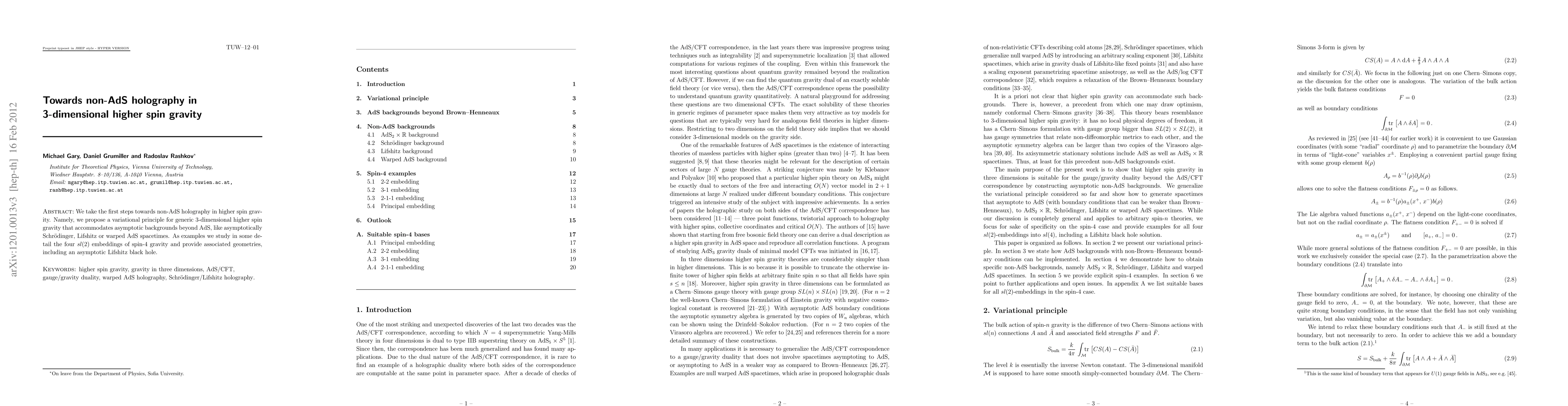 We take the first steps towards non-AdS holography in higher spin gravity. Namely, we propose a variational principle for generic 3-dimensional higher spin gravity that accommodates asymptotic backgrounds beyond AdS, like asymptotically Schrodinger, Lifshitz or warped AdS spacetimes. As examples we study in some detail the four sl(2) embeddings of spin-4 gravity and provide associated geometries, including an asymptotic Lifshitz black hole.
