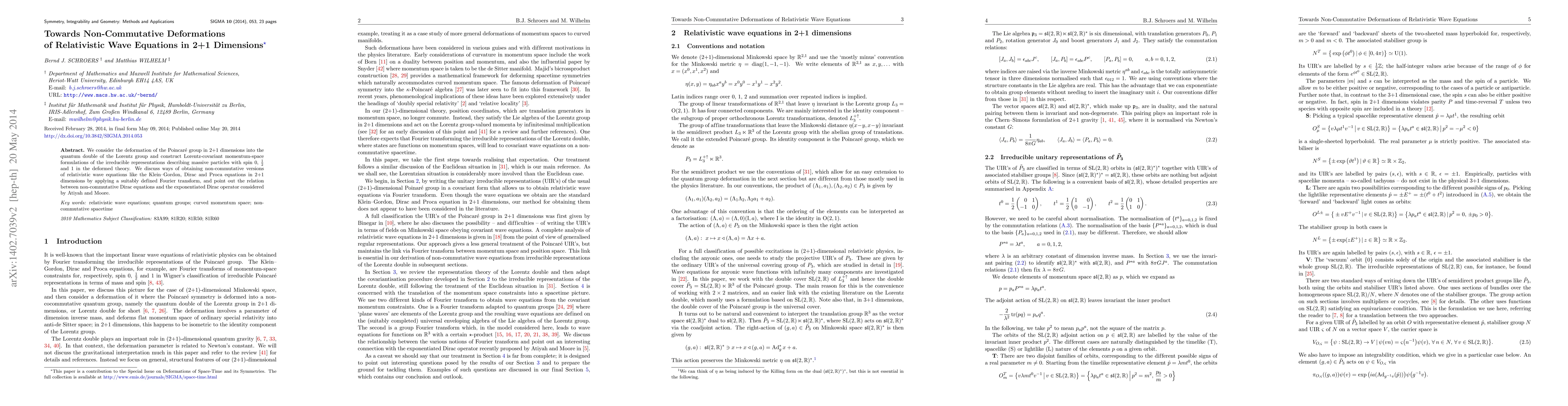 This paper explores the deformation of the Poincaré group in 2+1 dimensions into the quantum double of the Lorentz group, constructing Lorentz-covariant momentum-space formulations for massive particles. It also investigates non-commutative versions of relativistic wave equations by applying a Fourier transform and discusses their relation to the exponentiated Dirac operator.