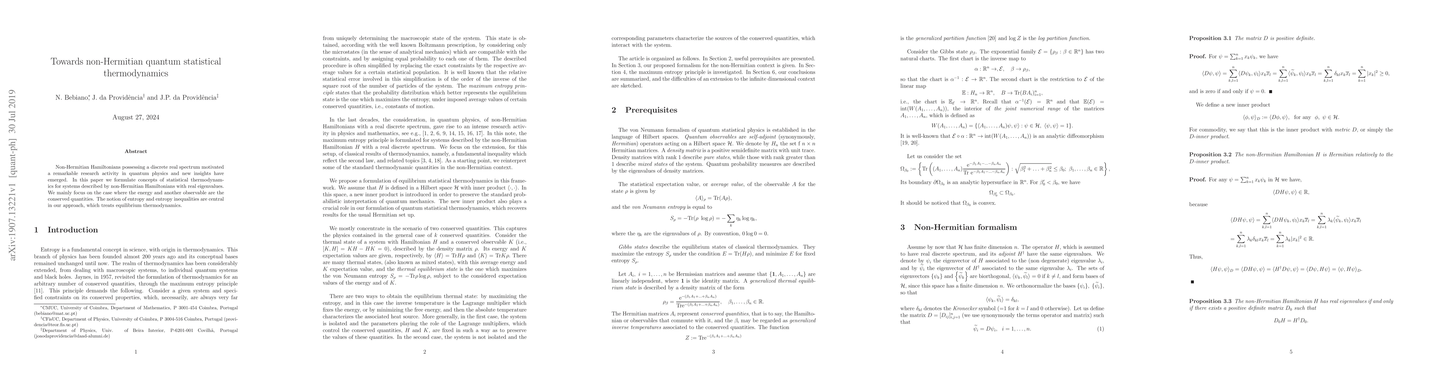 This paper formulates statistical thermodynamics concepts for systems with non-Hermitian Hamiltonians having real eigenvalues, focusing on systems where energy and another conserved observable are involved. It emphasizes the role of entropy and entropy inequalities in equilibrium thermodynamics.