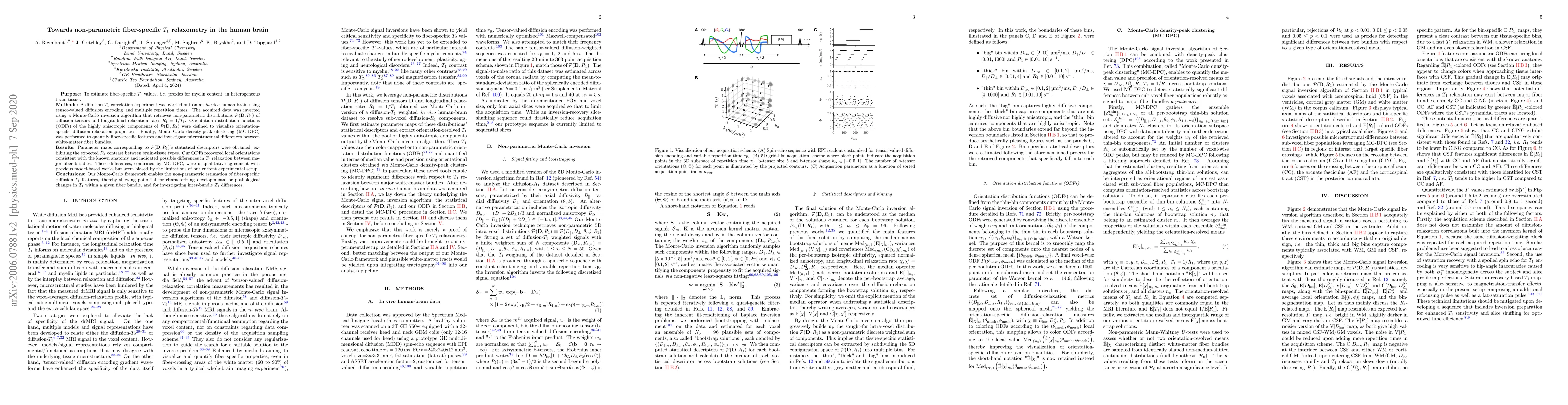 Purpose: To estimate fiber-specific $T_1$ values, i.e. proxies for myelin content, in heterogeneous brain tissue. Methods: A diffusion-$T_1$ correlation experiment was carried out on an in vivo human brain using tensor-valued diffusion encoding and multiple repetition times. The acquired data was inverted using a Monte-Carlo inversion algorithm that retrieves non-parametric distributions $\mathcal{P}(\mathbf{D},R_1)$ of diffusion tensors and longitudinal relaxation rates $R_1 = 1/T_1$. Orientation distribution functions (ODFs) of the highly anisotropic components of $\mathcal{P}(\mathbf{D},R_1)$ were defined to visualize orientation-specific diffusion-relaxation properties. Finally, Monte-Carlo density-peak clustering (MC-DPC) was performed to quantify fiber-specific features and investigate microstructural differences between white-matter fiber bundles. Results: Parameter maps corresponding to $\mathcal{P}(\mathbf{D},R_1)$'s statistical descriptors were obtained, exhibiting the expected $R_1$ contrast between brain-tissue types. Our ODFs recovered local orientations consistent with the known anatomy and indicated possible differences in $T_1$ relaxation between major fiber bundles. These differences, confirmed by MC-DPC, were in qualitative agreement with previous model-based works but seem biased by the limitations of our current experimental setup. Conclusions: Our Monte-Carlo framework enables the non-parametric estimation of fiber-specific diffusion-$T_1$ features, thereby showing potential for characterizing developmental or pathological changes in $T_1$ within a given fiber bundle, and for investigating inter-bundle $T_1$ differences.
