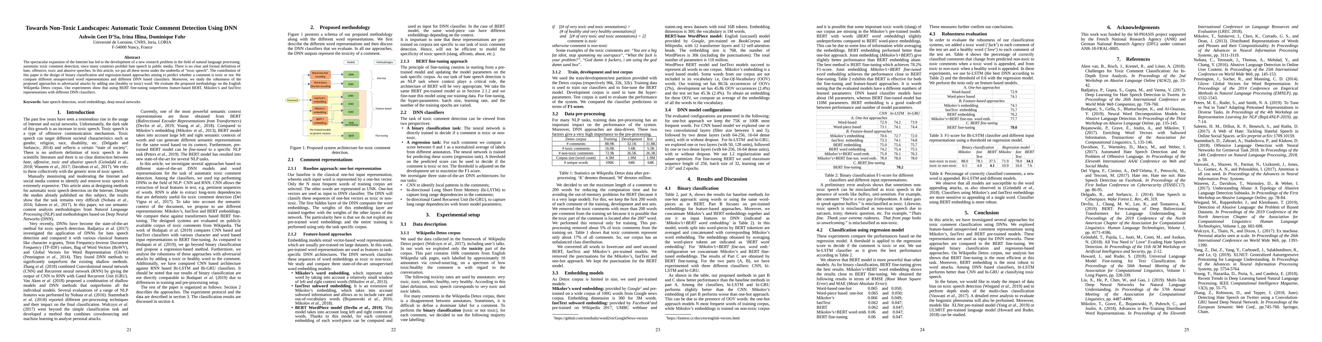 The spectacular expansion of the Internet has led to the development of a new research problem in the field of natural language processing: automatic toxic comment detection, since many countries prohibit hate speech in public media. There is no clear and formal definition of hate, offensive, toxic and abusive speeches. In this article, we put all these terms under the umbrella of "toxic" speech. The contribution of this paper is the design of binary classification and regression-based approaches aiming to predict whether a comment is toxic or not. We compare different unsupervised word representations and different DNN based classifiers. Moreover, we study the robustness of the proposed approaches to adversarial attacks by adding one (healthy or toxic) word. We evaluate the proposed methodology on the English Wikipedia Detox corpus. Our experiments show that using BERT fine-tuning outperforms feature-based BERT, Mikolov's and fastText representations with different DNN classifiers.