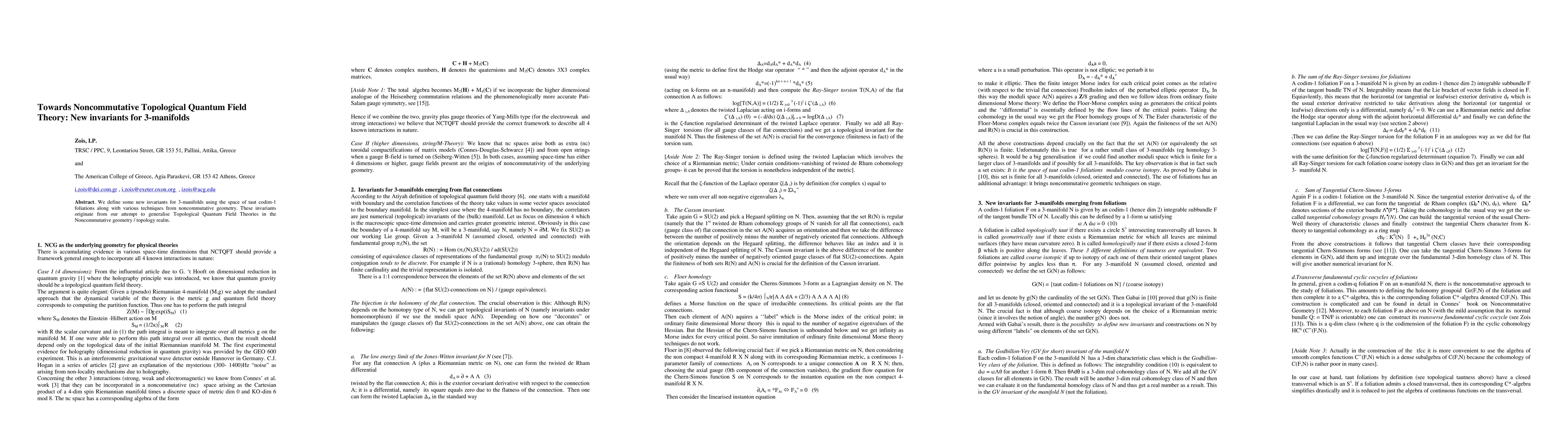 Summary: This paper introduces novel invariants for 3-manifolds derived from taut codimension-1 foliations and noncommutative geometry techniques, aiming to generalize Topological Quantum Field Theories within the framework of noncommutative topology.
