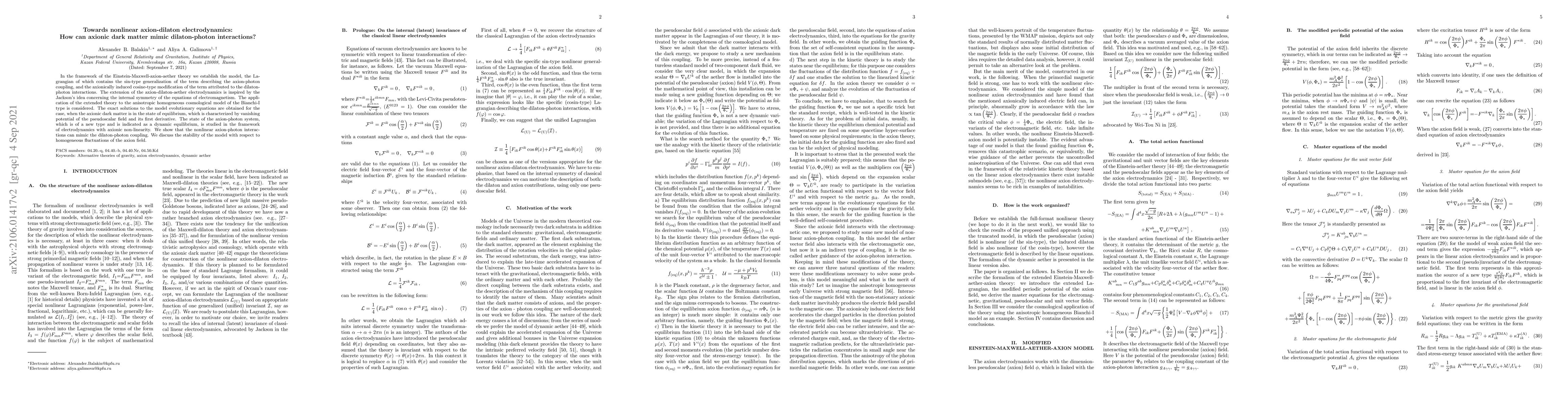 In the framework of the Einstein-Maxwell-axion-aether theory we establish the model, the Lagrangian of which contains the sin-type generalization of the term describing the axion-photon coupling, and the axionically induced cosine-type modification of the term attributed to the dilaton-photon interactions. The extension of the axion-dilaton-aether electrodynamics is inspired by the Jackson's idea concerning the internal symmetry of the equations of electromagnetism. The application of the extended theory to the anisotropic homogeneous cosmological model of the Bianchi-I type is considered. The exact solutions to the model evolutionary equations are obtained for the case, when the axionic dark matter is in the state of equilibrium, which is characterized by vanishing potential of the pseudoscalar field and its first derivative. The state of the axion-photon system, which is of a new type and is indicated as a dynamic equilibrium, is studied in the framework of electrodynamics with axionic non-linearity. We show that the nonlinear axion-photon interactions can mimic the dilaton-photon coupling. We discuss the stability of the model with respect to homogeneous fluctuations of the axion field.